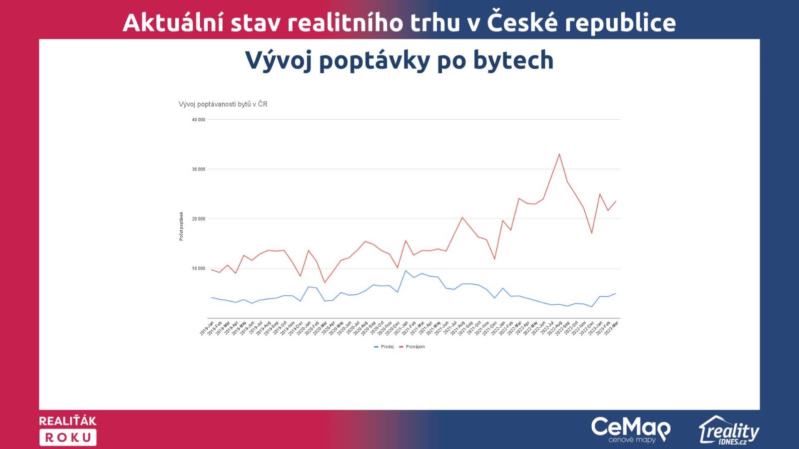 No, tak my jak sledujeme data vlastně z call centra, tak zaznamenají vlastně všechny ty reakce klientů a porovnáváme je vlastně v týdenním, měsíčním srovnání. A je vidět, že od začátku roku opravdu je tady navýšená poptávka po nákupech nemovitostí. Tedy, když teda to stáhnu jenom k těm jako prodejům nebo nákupům. A bylo otázkou, jestli po těch prvních týdnech v lednu, kdy to bylo až překvapující, se to jakoby nesníží nebo nepoleví. A vidíme, že ještě teď za březen vlastně to, ten trend pokračuje. A ta poptávkou opravdu je zvýšená někde o 30 %. Velmi slabý bylo období toho podzimu. A já jsem vlastně při tom povídání tady, když jsme se bavili někdy v listopadu, v prosinci, tak trošku jako předpovídal, že by mohlo dojít k tomu, že opravdu ten trh s těma cenama se sníží tak, že to vyvolá právě novou vlnu vlastně koupěchtivých klientů a ta tady podle mě dneska je. Protože dneska je výhodný koupit nemovitost. Samozřejmě nemovitost, která je zlevněná, která prošla tou cenovou redukcí až třeba i o 30 %. A tady bych právě možná řekl, že ti investoři se teď vlastně probouzí, že jsme je tady možná neměli. Proč by taky investor kupoval v době, kdy nemovitosti padají a není zřejmý, kam až dopadnou. Ale myslím si, že větší pokles než 30 % oproti cenám třeba v tomto období minulýho roku, už jako bych neočekával. Takže to je podle mě trend té aktuální doby. Zlevněný nemovitosti se prodávají velmi dobře. Vlastně na obratech realitních kanceláří to nijak jako zásadně není. Obraty vlastně i meziroční ve stejným období jsou vlastně obdobný. A samozřejmě ještě možná poslední jako zmínka k těm nájmům. Tady to potvrzuju, jo. Ono se to samozřejmě asi dalo i očekávat, že ten trh se nasytí. A tím, že investoři samozřejmě i kupují ty nemovitosti s očekáváním výnosů z nájmu, nejenom zhodnocení vlastně v té ceně, což je další kritérium, který opravdu zajímavý bude, nebo je. V momentě, kdy nám to spadlo o těch 30 %. Tak já, pokud bych koupil byt, tak budu očekávat, že mi to o těch 30 % do 3 let vrátí. Ale samozřejmě na trh se nám dostává velký množství bytů, který jsou určených k nájmu a samozřejmě ta klientela nebo ta poptávka se do jisté míry jakoby naplnila. Takže tady je za nás možná stagnace. Možná i lehká korekce směrem dolů u těch nájmů, protože jich na tom trhu je teď víc.