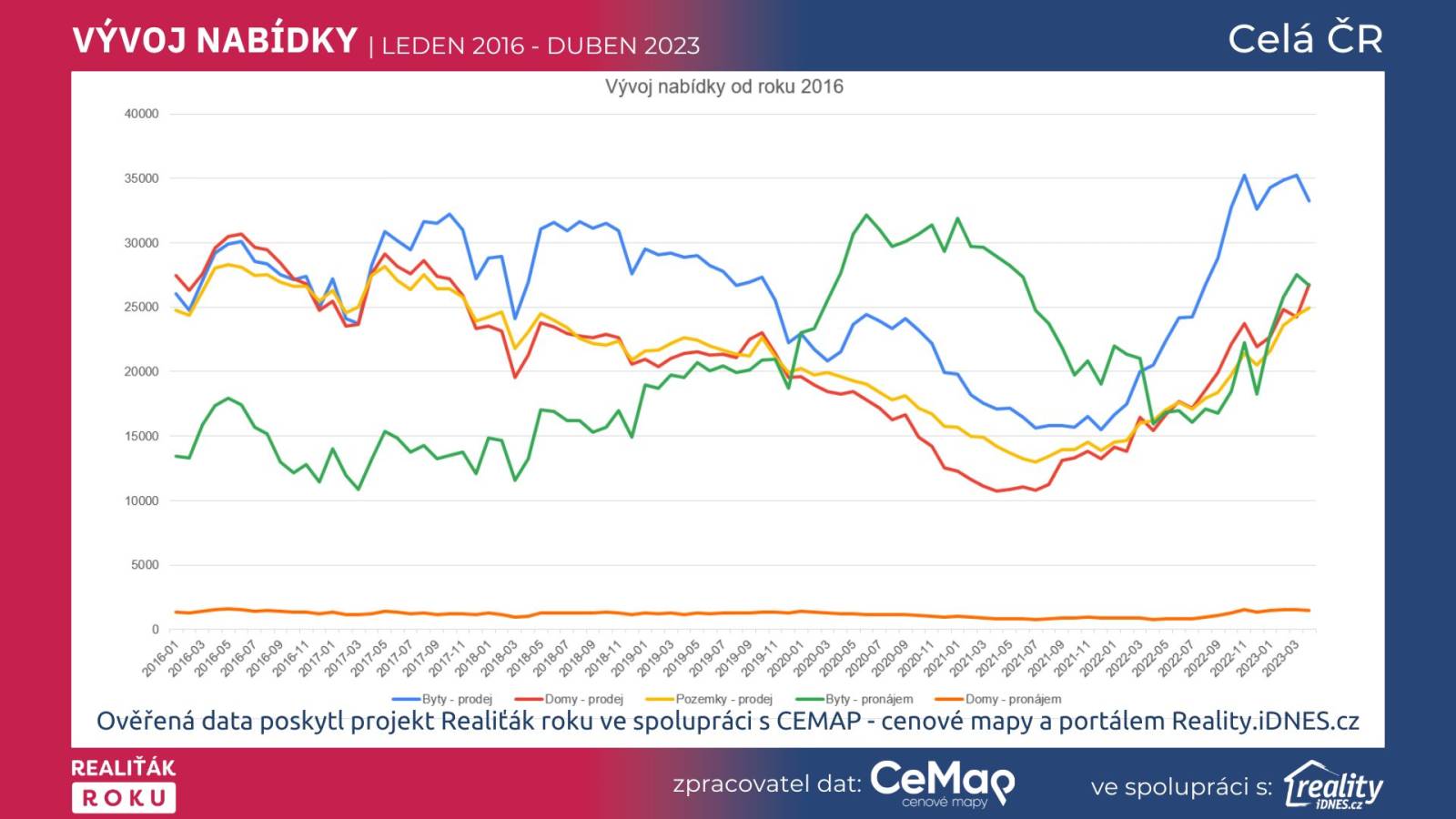 Graf č. 10: Vývoj nabídky leden 2016 - duben 2023 (ověřená exluzivní data projektu Realiťák roku ve spolupráci s CEMAP - cenové mapy a portálu Reality.iDNES.cz)