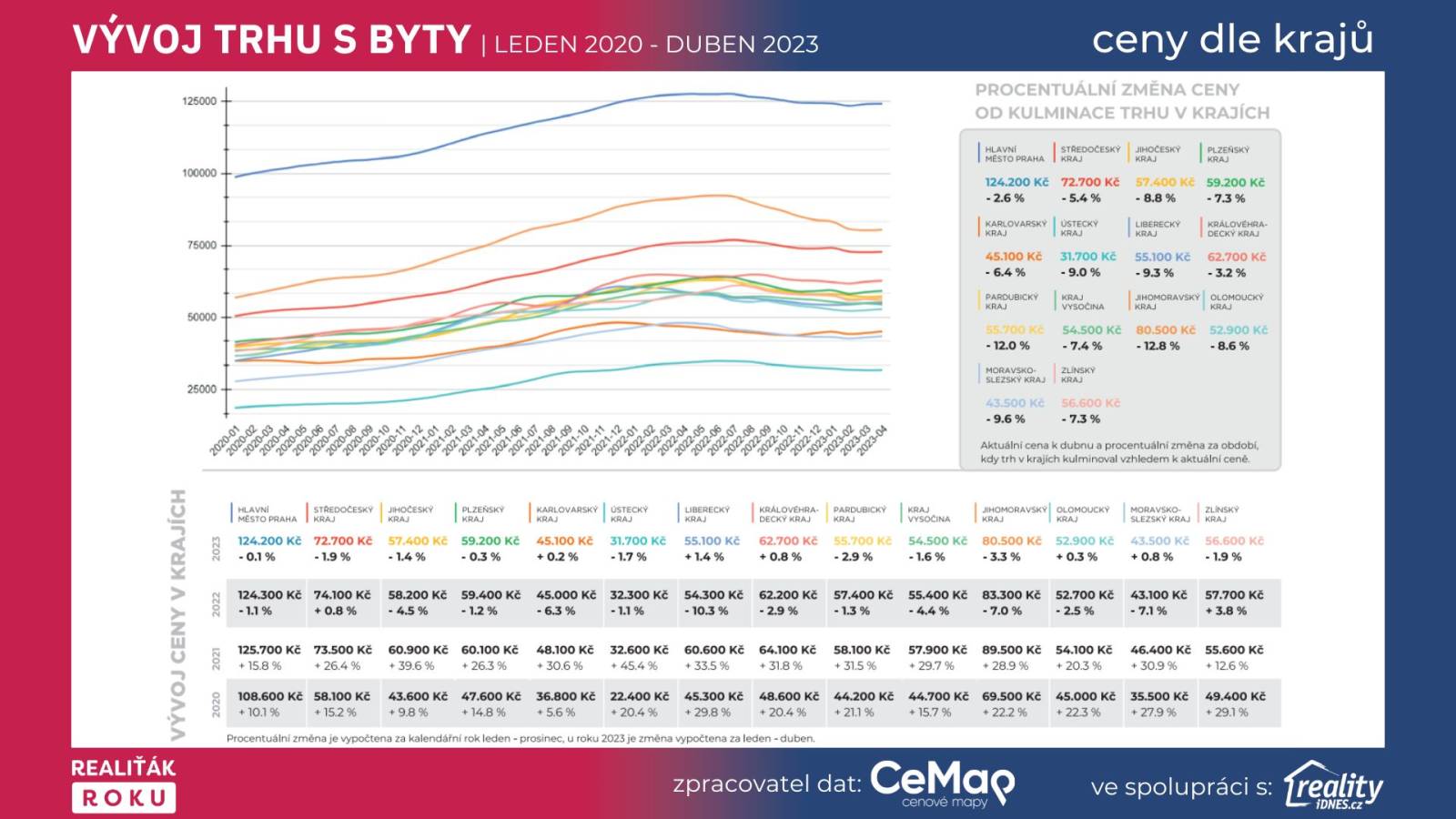 Graf č. 1: Vývoj trhu s byty leden 2020 - duben 2023 (ověřená exluzivní data projektu Realiťák roku ve spolupráci s CEMAP - cenové mapy a portálu Reality.iDNES.cz)
