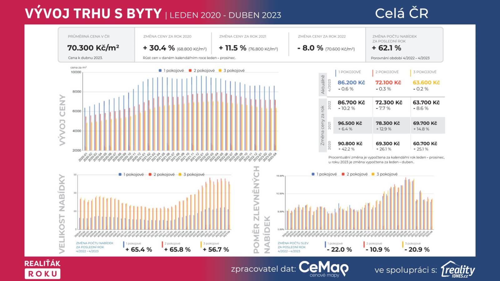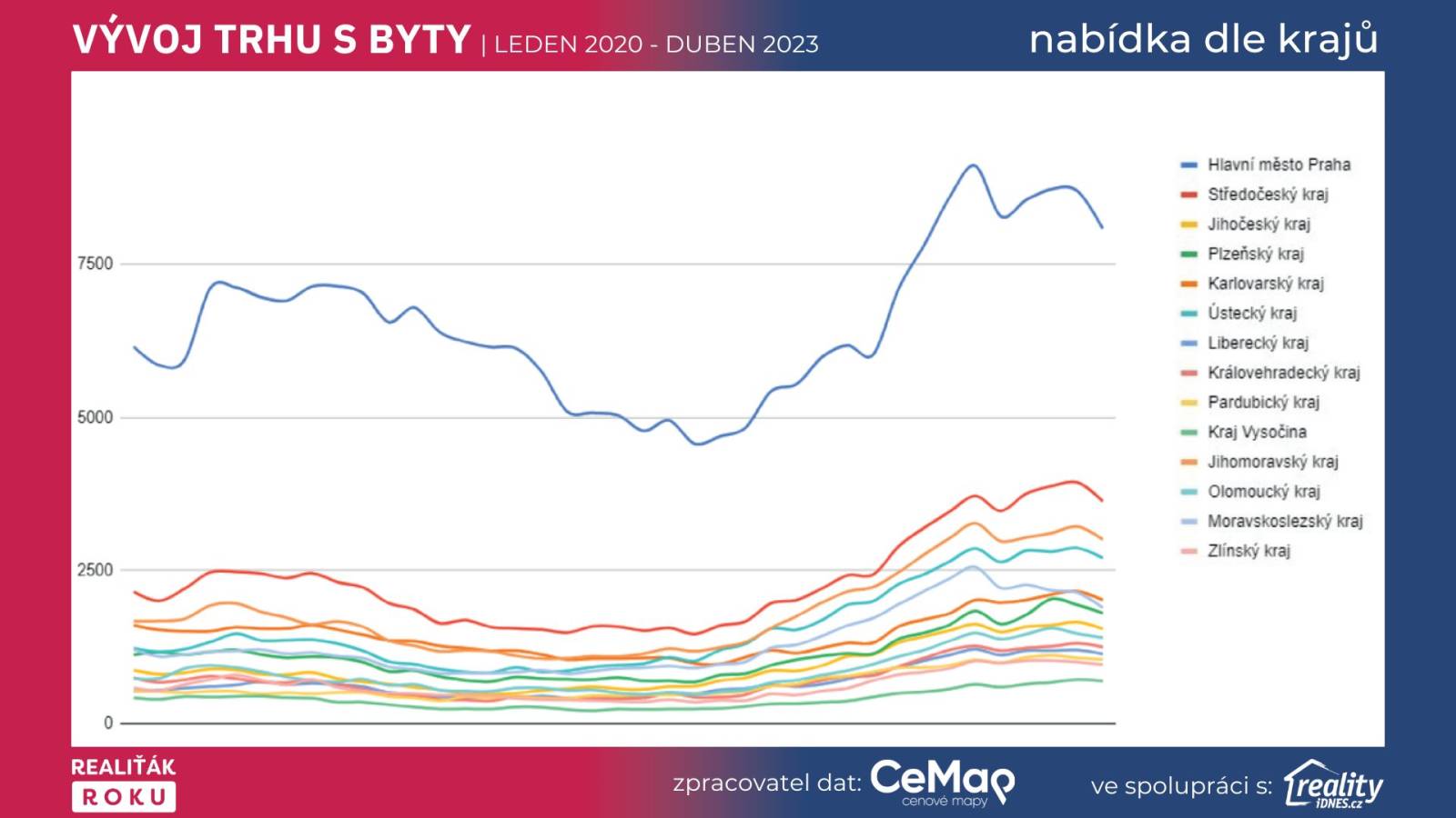 Graf č. 3: Vývoj trhu s byty leden 2020 - duben 2023 (ověřená exluzivní data projektu Realiťák roku ve spolupráci s CEMAP - cenové mapy a portálu Reality.iDNES.cz)