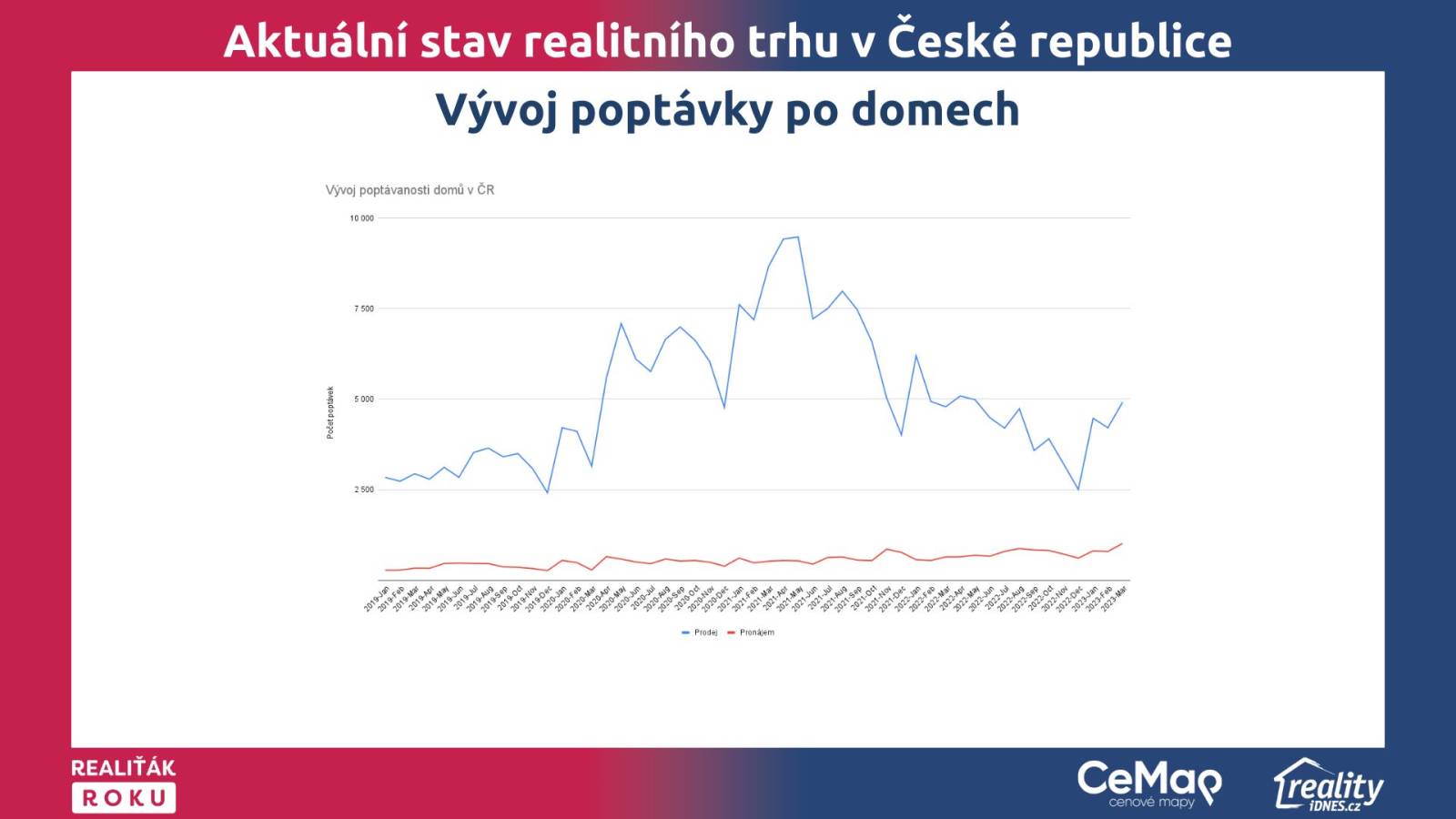 Tak zkusím stručně. Tak z hlediska prodejů jako tak, jak čteme v novinách o zamrzlém trhu, tak to my nepotvrzujeme. Když to občas nějaký novinář vloží našim makléřům jako pod jejich výstup. A oni jsou z toho pak rozezlený. Ten trh vlastně překvapivě celkem jako jede slušnou rychlostí. Takže přesto, že není hnanej financováním z bank, ale prostě jako jenom potřebou lidí, tak je za mě velmi dobrý úrovni. A prodávat se dá, ceny stále mírně klesají za nás. Co ještě tam jsme vypozorovali z úplně posledních dat a zase těžko říct, jestli je to trend, se to otočilo v průběhu toho prvního kvartálu, že v Praze, Brně začaly klesat ceny pronájmů.