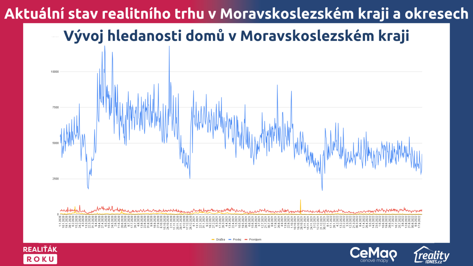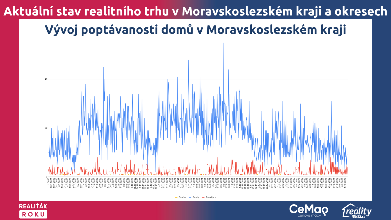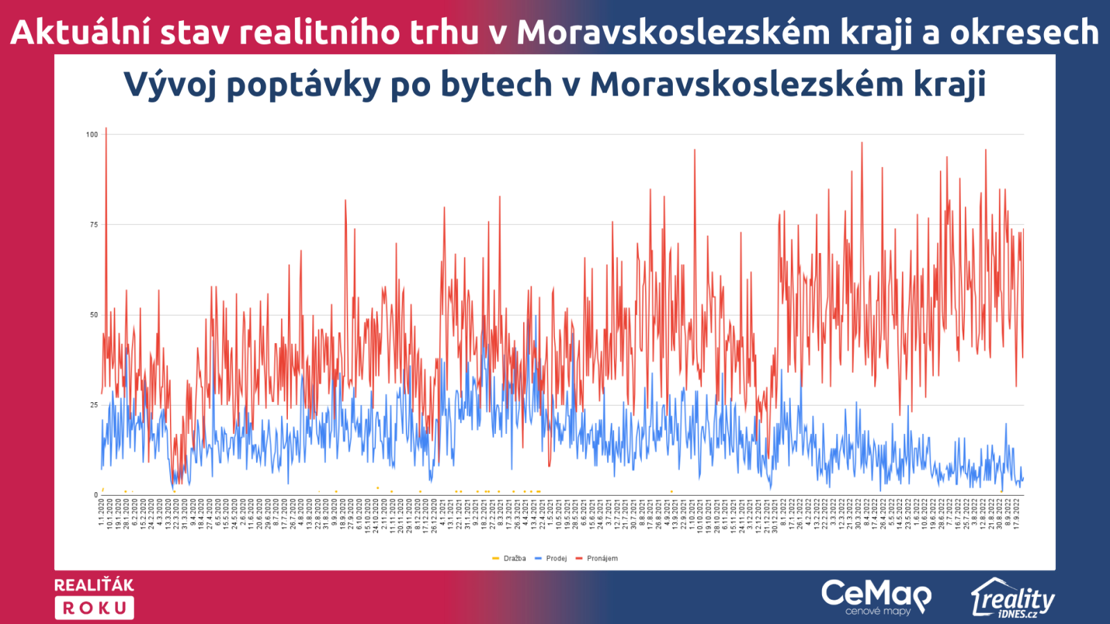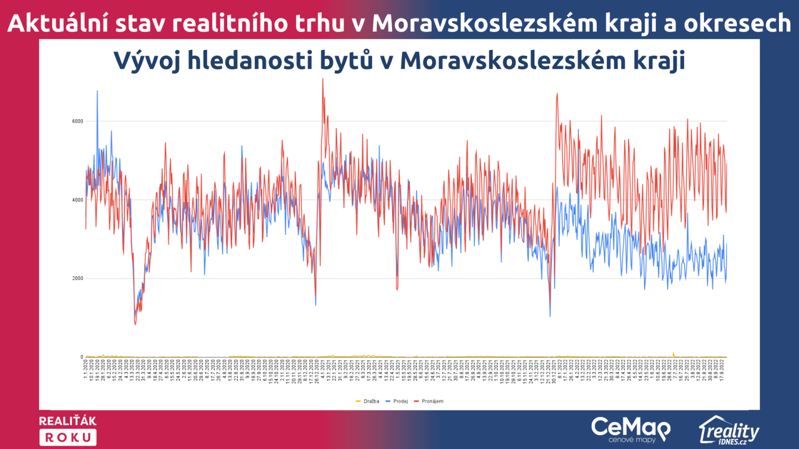 Každopádně já tam dneska nasharuju jeden takový zajímavý graf, což je vývoj hledanosti bytů v Moravskoslezském kraji. Je to rozdělený na prodej a pronájem. Vidíte ten stav zase od ledna roku 2020 do 17. 9. tzn. je to stav chvilinku nazpátek. Můžeme vidět dva nebo jeden hlavní trend, a to je to, že v celém Moravskoslezském kraji podle dat, které máme k dispozici, se vlastně někdy od ledna tohohle roku - plus minus - odpovídá to tomu, výrazně narostl na internetu hledání bytů v pronájmu oproti bytům k prodeji. Ty byty pronájmů jsou ty červené, ty byty k prodeji jsou ty modré a ten rozdíl výrazně k tomu narostl. A dám tam ještě druhý graf, který na to navazuje samozřejmě. A to je graf poptávanosti.