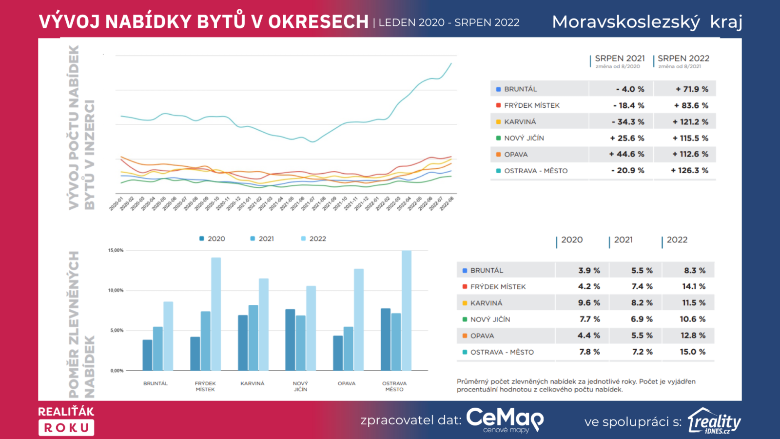 Graf č. 6 - vývoj nabídky bytů v okresech v Moravskoslezském kraji - leden 2020 - srpen 2022 dle ověřených exluzivních dat projektu Realiťák roku ve spolupráci CEMAP - cenové mapy a portálu Reality.iDNES.cz