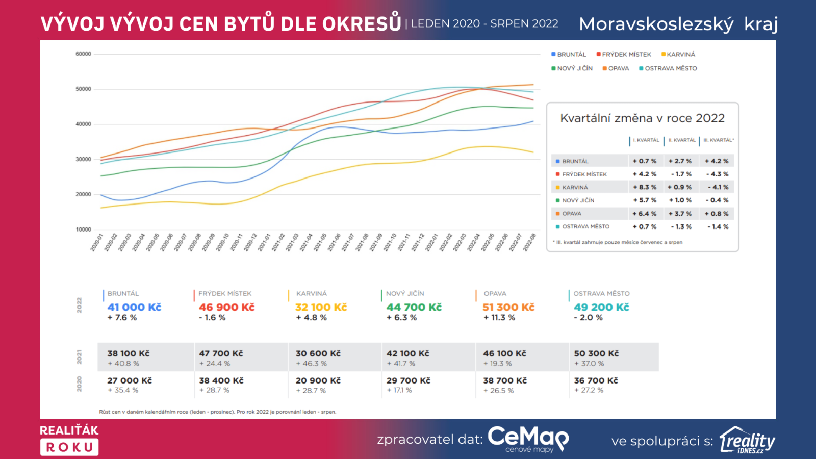 Graf č. 5 - vývoj cen bytů dle okresů v Moravskoslezkém kraji - leden 2020 - srpen 2022 dle ověřených exluzivních dat projektu Realiťák roku ve spolupráci CEMAP - cenové mapy a portálu Reality.iDNES.cz