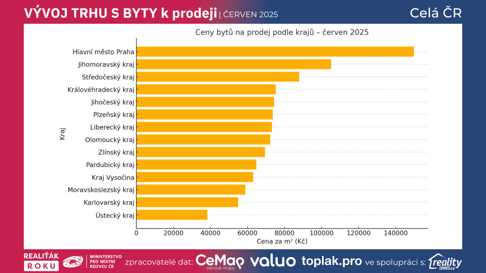 Český realitní trh v červnu 2025 ukazuje extrémní regionální rozdíly. Zatímco za metr čtvereční bytu v Praze zaplatíte téměř 150 000 Kč, v Ústeckém kraji vás vyjde v průměru na 38 000 Kč. Rozdíl přesahuje 110 000 Kč za každý metr – a pro kupující to znamená obrovsky rozdílné šance na pořízení vlastního bydlení.