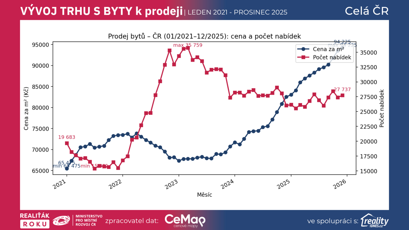 Český trh bytů má za sebou pět let, které změnily pravidla hry. Cena za m² v celé ČR se posunula z 01/2021 (65 475 Kč/m²) na 12/2025 (94 225 Kč/m²), tedy o +43,9 %. Ještě zásadnější je ale změna tempa: zatímco trh uměl v „opatrných“ měsících výrazně zpomalit, na konci roku 2025 naopak zrychlil na nejkratší dobu nabízení v celém pětiletém období. V 12/2025 se byty v průměru nabízely 78 dní, přitom v nabídce bylo 27 737 bytů – tedy nejde o „nulovou nabídku“, ale o trh, který rychleji vyhodnocuje kvalitu a cenu.