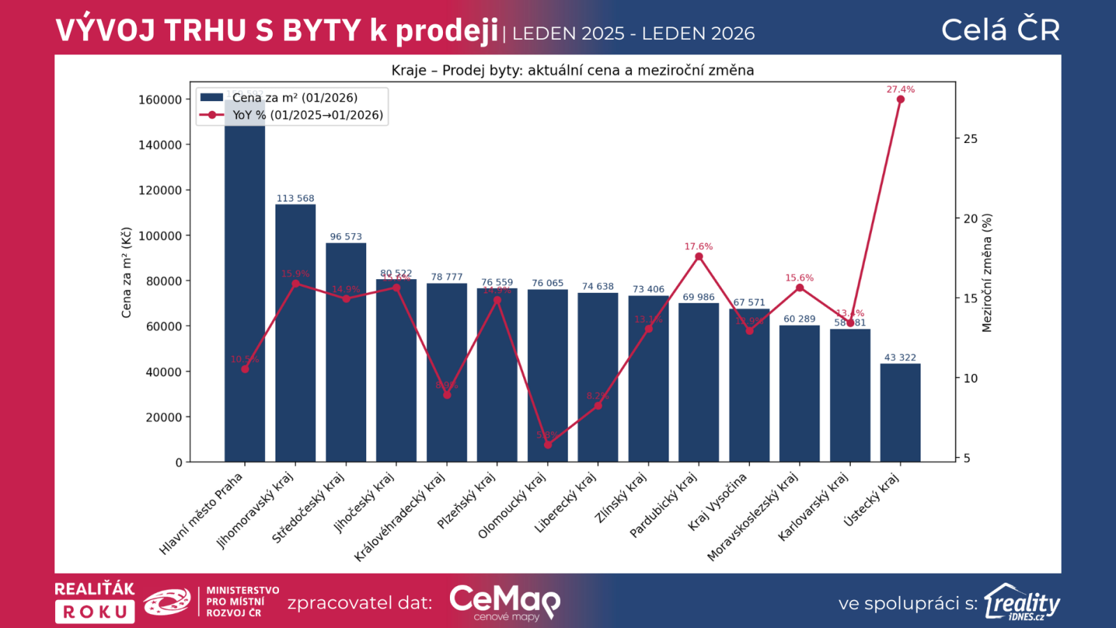 Ústecký kraj – +27,43 % (01/2026: 43 322 Kč/m²)