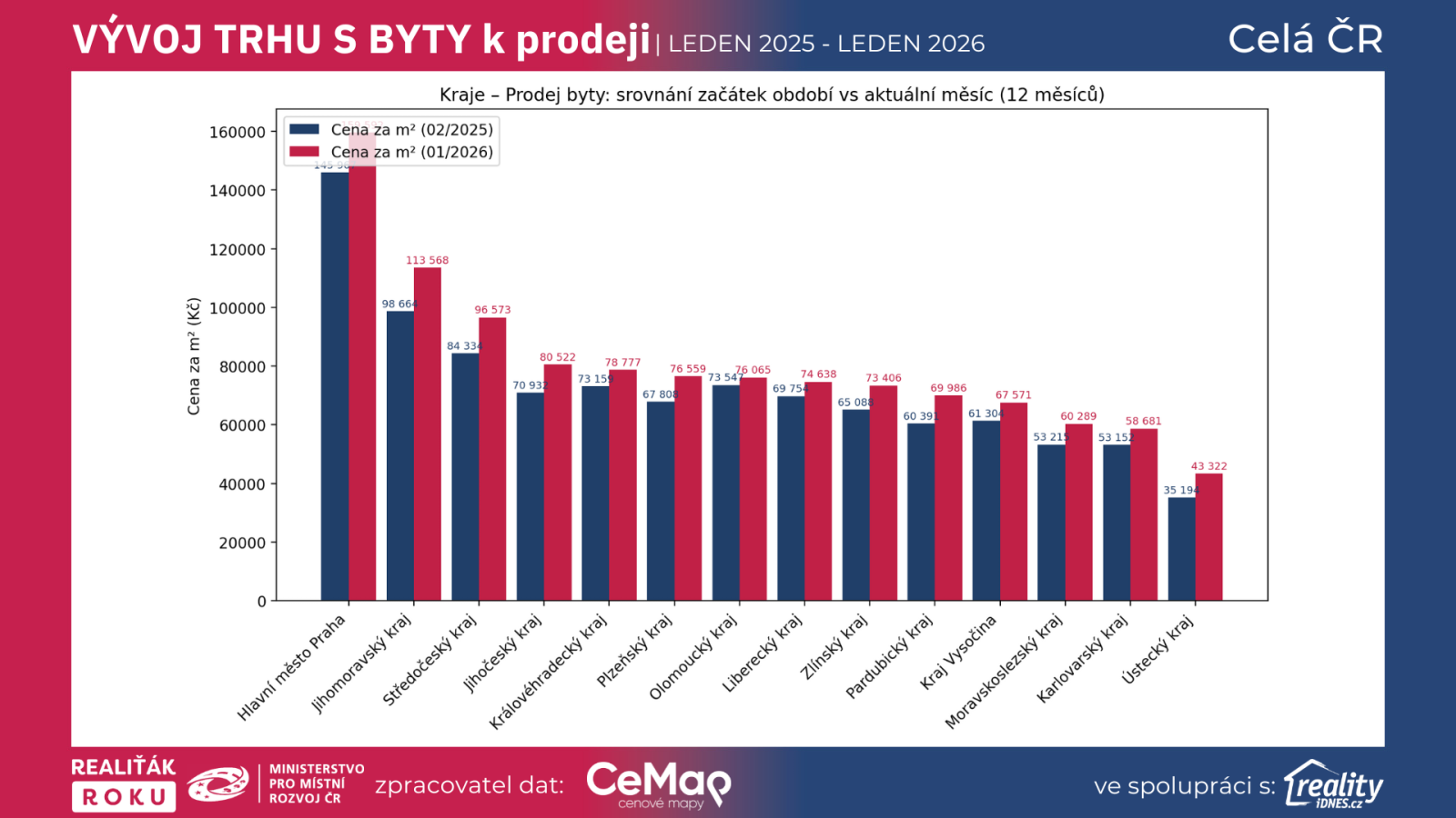 Cena za m²: 83 060 (01/2025) → 94 755 Kč/m² (01/2026) = +14,08 %