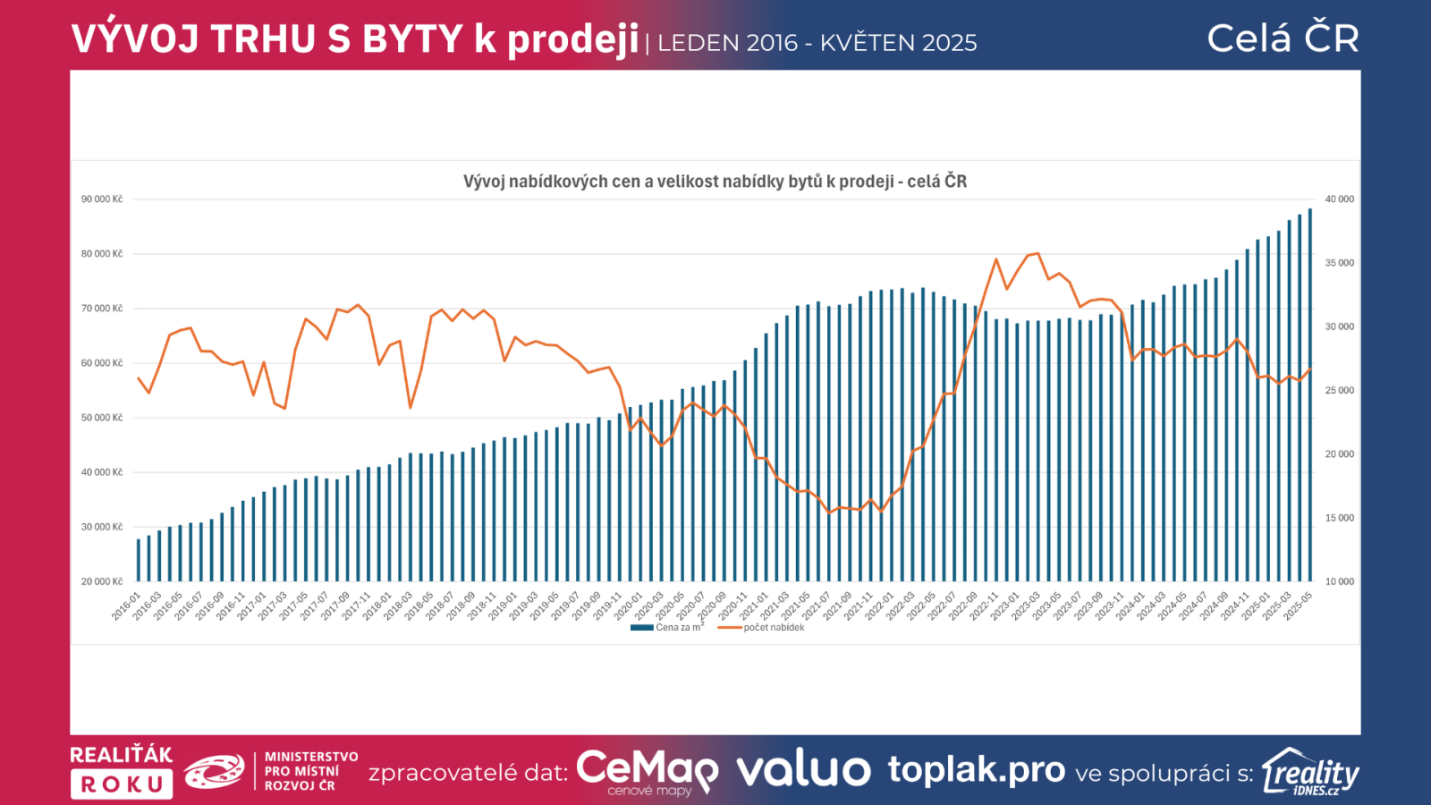 Grafy a data jsou ověřené exkluzivní data projektu Realiťák roku ve spolupráci CEMAP - cenové mapy, VALUO.cz, TOPLAK.pro a portálu Reality.iDNES.cz spolu s Ministerstvem pro místní rozvoj