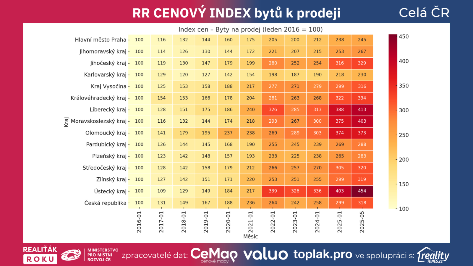 Cenová mapa realit: Jak se od roku 2016 změnily ceny bytů v jednotlivých krajích? Od roku 2016 sledujeme dramatický vývoj cen bytů napříč Českou republikou. Zatímco v některých regionech se ceny zdvojnásobily, jinde dokonce ztrojnásobily. Nová data ukazují, kde jsou dnes byty nejdražší, kde ceny rostou nejrychleji – a kde naopak dochází ke stagnaci. V článku najdete cenové indexy za jednotlivé kraje i celou ČR, a to včetně aktuálních hodnot z května 2025.