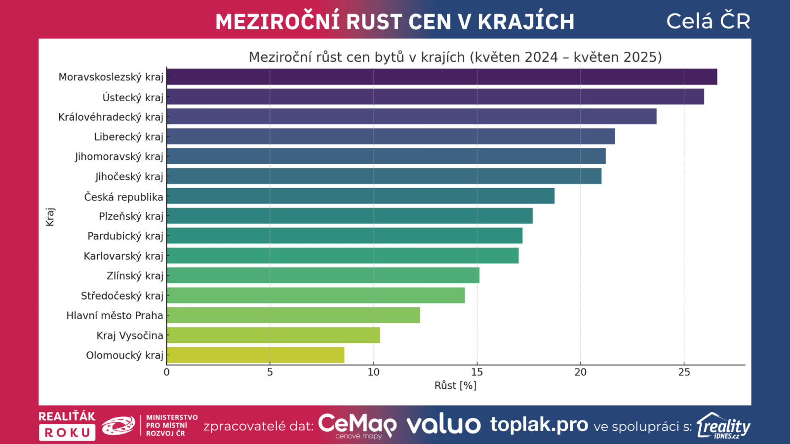 Mezi květnem 2024 a květnem 2025 rostly ceny bytů ve všech krajích.