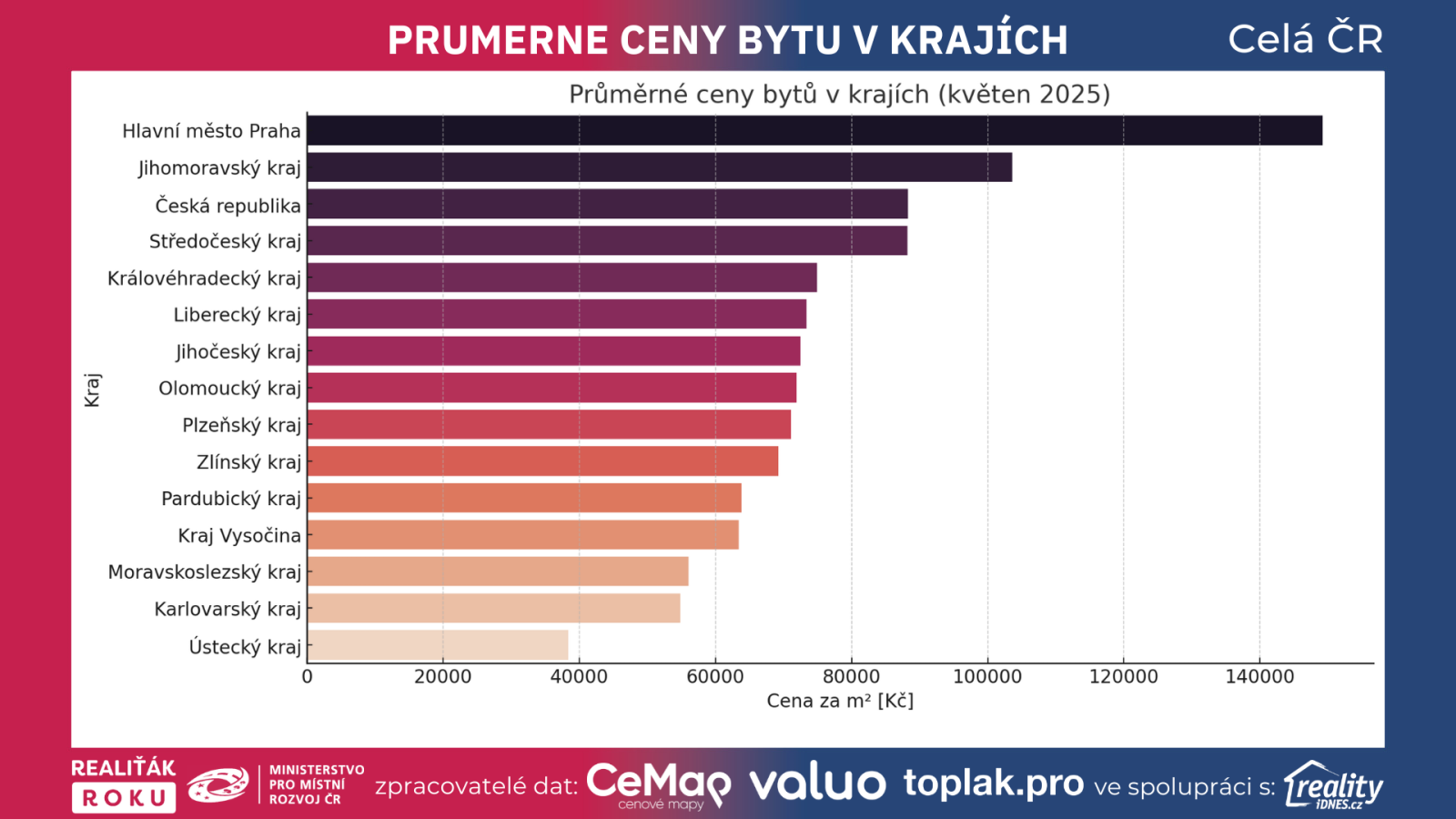 I přes mírnější tempo růstu zůstává Praha nejdražší lokalitou v celé republice. V květnu 2025 zde průměrná nabídková cena bytů překročila hranici 138 000 Kč za m².