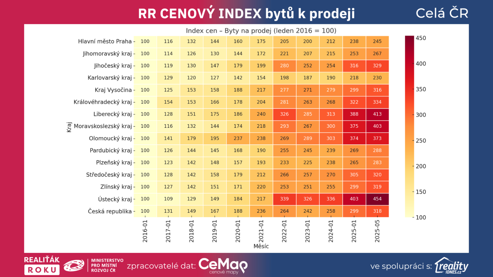 Za posledních devět let vzrostly ceny starších bytů ve všech krajích České republiky, v některých oblastech dokonce o stovky procent. Zatímco v roce 2016 se dalo pořídit bydlení pod 10 tisíc korun za metr čtvereční, dnes se i v nejlevnějších krajích platí násobky této částky. Nejvýraznější nárůst evidujeme v Ústeckém, Moravskoslezském a Olomouckém kraji. Vyplývá to z květnových dat projektu Realiťák roku.