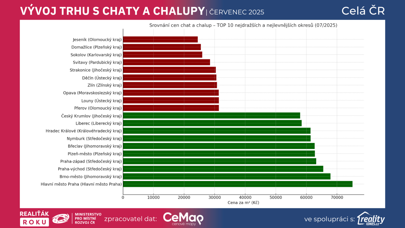 Ceny chat a chalup se během posledních pěti let více než zdvojnásobily. Zatímco v celostátním průměru se cena pohybuje okolo 43 000 Kč/m², některé okresy překročily hranici 70 000 Kč/m². Rozdíly mezi regiony jsou přitom výrazné – podívejte se, kde zaplatíte nejvíce a kde si lze rekreaci ještě dovolit.