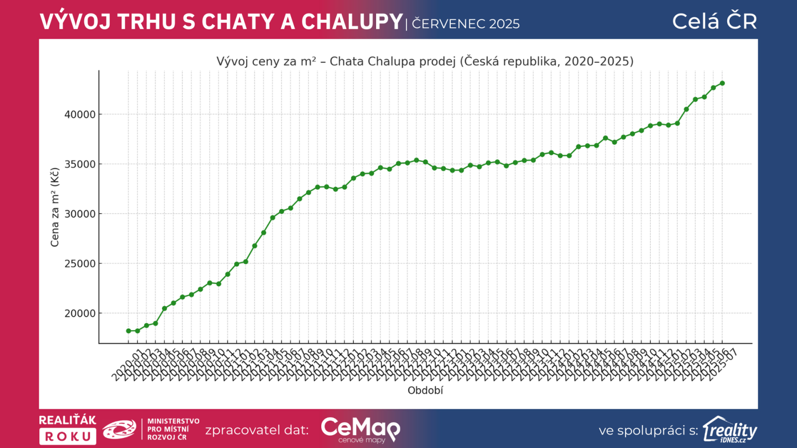 Data ukazují jednoznačný trend. V lednu 2020 se průměrná cena rekreačních objektů v Česku pohybovala na úrovni 18 197 Kč/m². Do července 2025 stoupla na 43 131 Kč/m², tedy o více než 137 %.