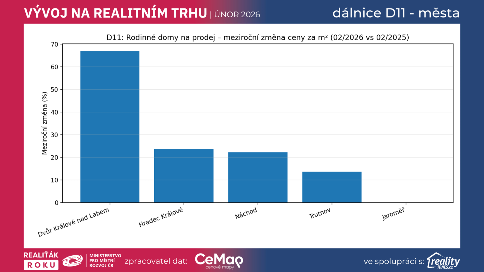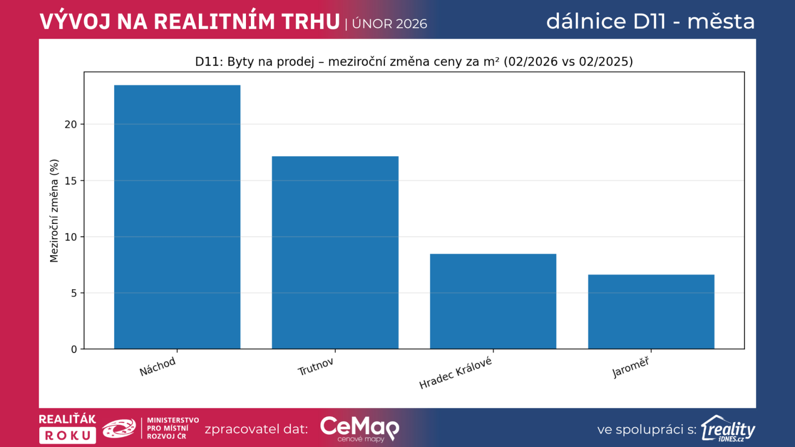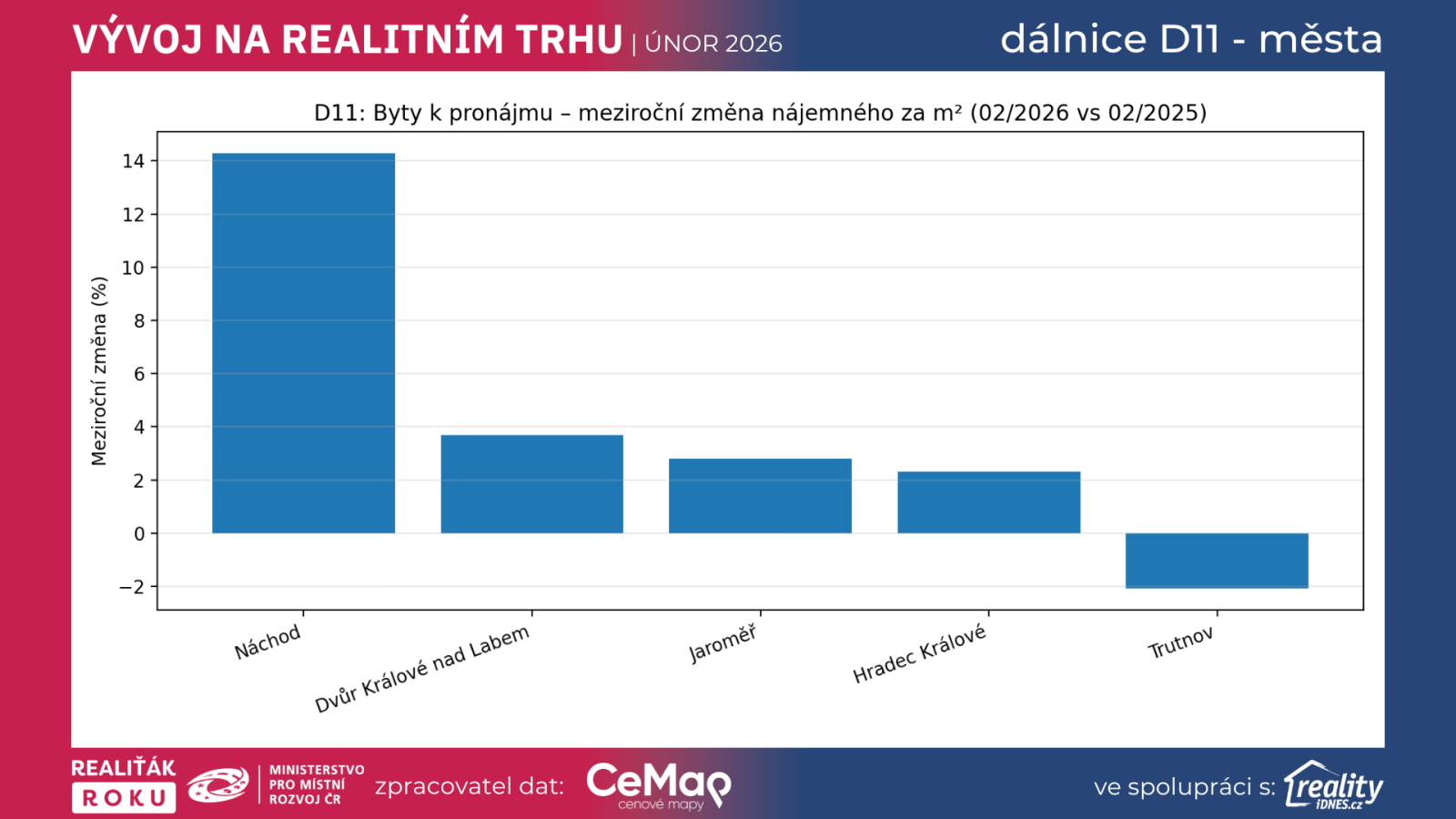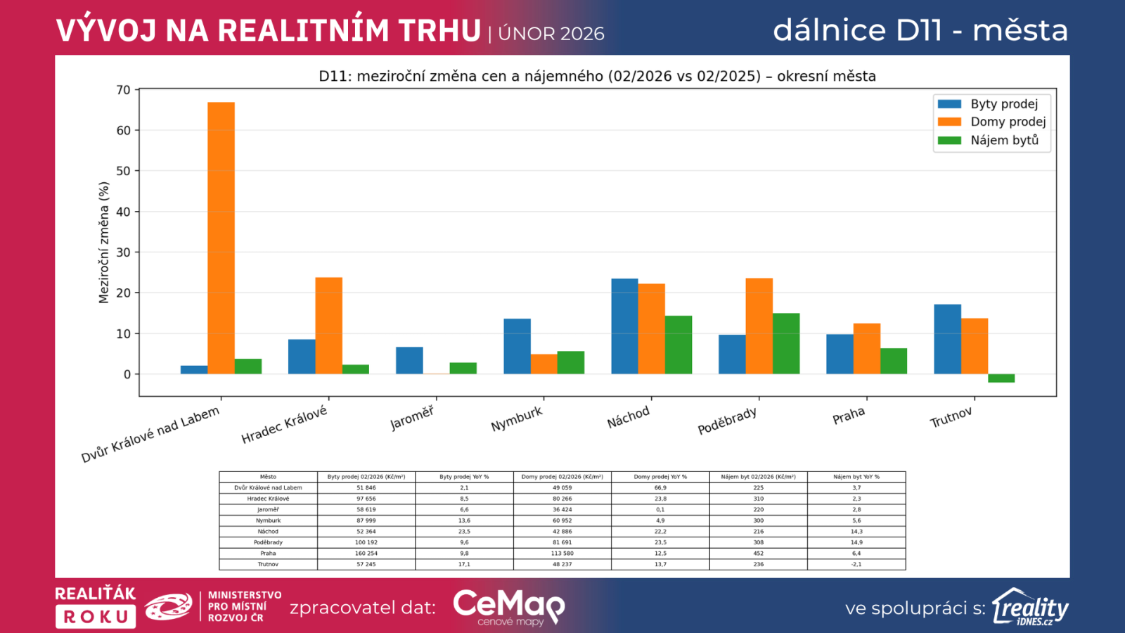 Metodika: Srovnání 02/2026 vs. 02/2025 pro okresní města v koridoru D11. Aby čísla nebyla zkreslená malým vzorkem, uvádíme pouze města s více než 10 aktivními nabídkami v obou měsících (v daném segmentu).