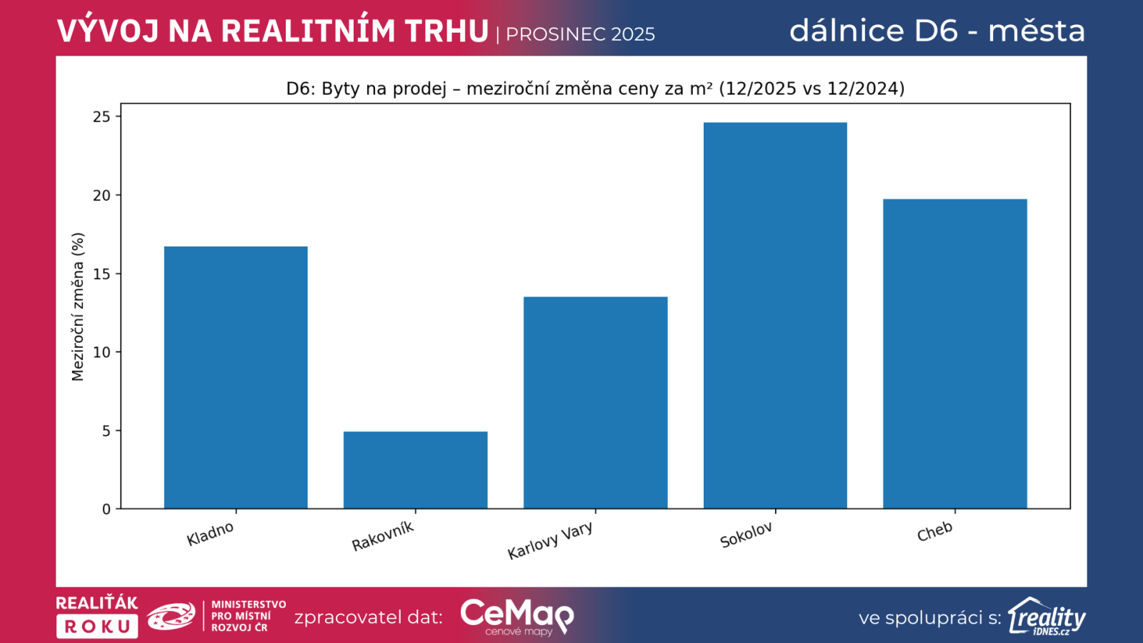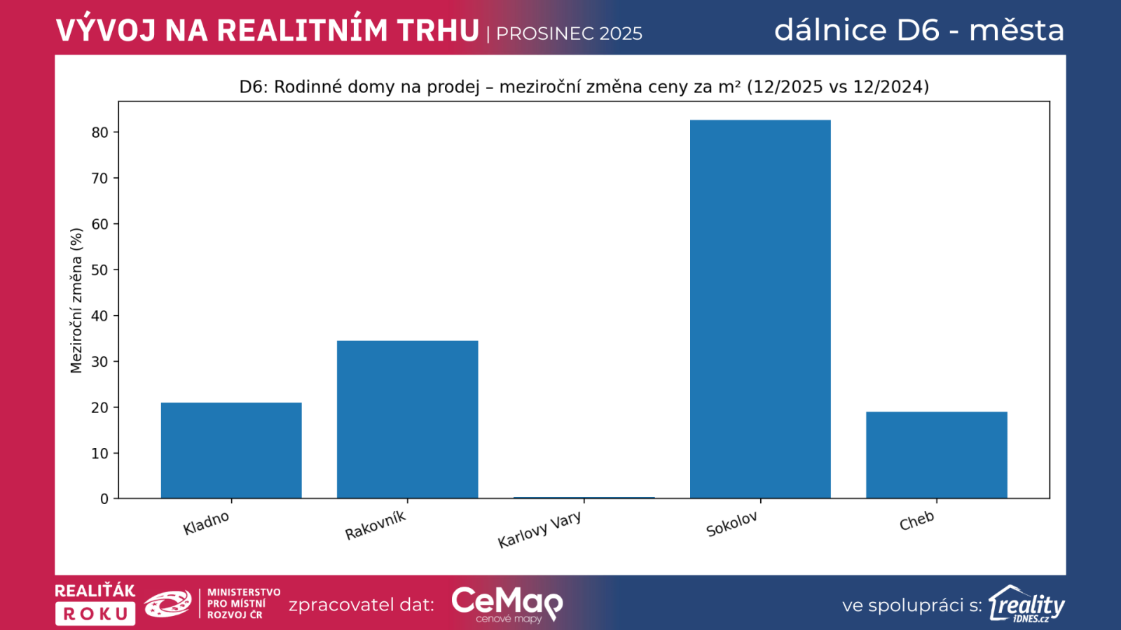 Dálnice D6 už dávno není jen dopravní téma. V praxi funguje jako „zrychlovač“ realitního trhu – čím lepší dostupnost a jistější dojezd, tím širší okruh zájemců a tím větší tlak na ceny. Data za prosinec 2025 vs. prosinec 2024 ukazují, že v koridoru D6 rostly ceny nejen u bytů, ale místy i u rodinných domů velmi dynamicky. A zároveň se v řadě lokalit výrazně zkrátila doba prodeje. Právě v takových obdobích se výrazně ukazuje, jak důležitou roli hrají kvalitní realitní makléři a proč projekt Realiťák roku dlouhodobě tlačí na profesionalitu, transparentnost a správné nastavení očekávání prodávajících i kupujících.