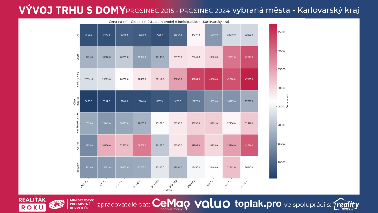 Průměrná cena rodinných domů vzrostla o 8 % na 30 000 Kč/m². Nejvyšší ceny jsou v Karlových Varech (35 000 Kč/m²), zatímco Cheb a Sokolov nabízejí dostupnější možnosti s cenami 25 000 Kč/m² a 20 000 Kč/m².
