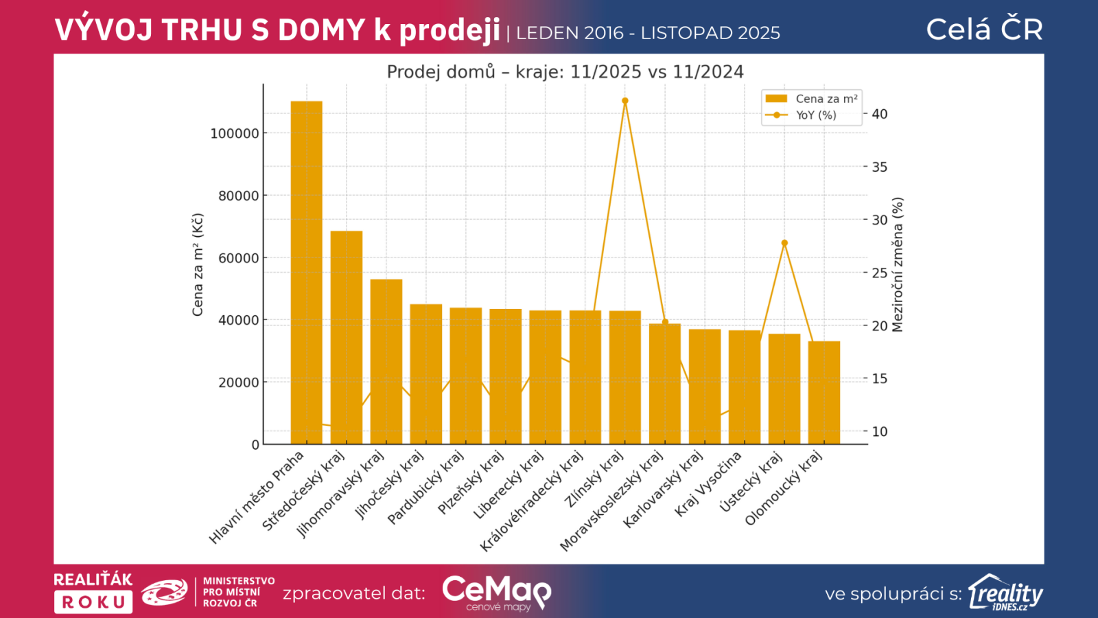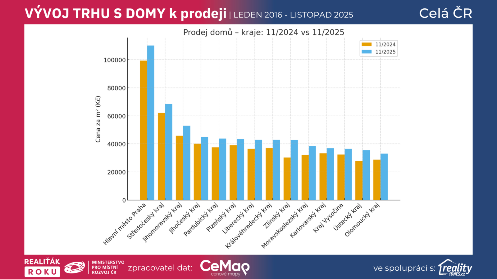 Domy na prodej: srpen 2025 49 023 Kč/m², za tři roky +16,1 %. Mezi kraji ale panují „dva trhy“
