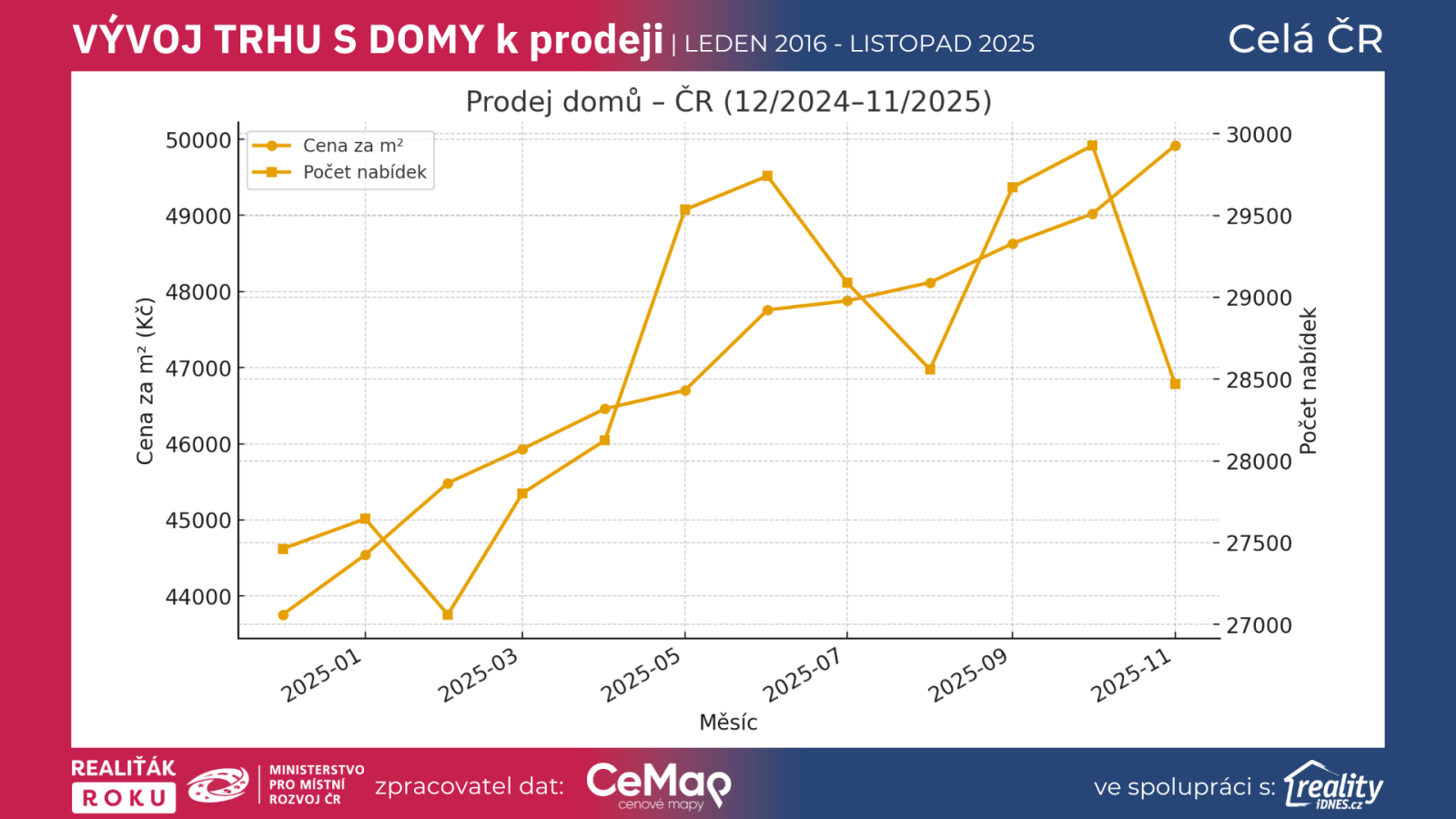 Poslední rok přinesl na trh rodinných domů jeden z největších obratů za poslední dekádu. Průměrná cena prodávaných domů vzrostla mezi 11/2024 a 11/2025 z 43 756 Kč/m² na 49 919 Kč/m² (+14,1 %). Ještě dramatičtější je pokles doby nabízení: z 227 dní na 103 dní (–54,6 %). Domy, které se loni inzerovaly tři čtvrtě roku, se dnes prodají často za dva až tři měsíce.