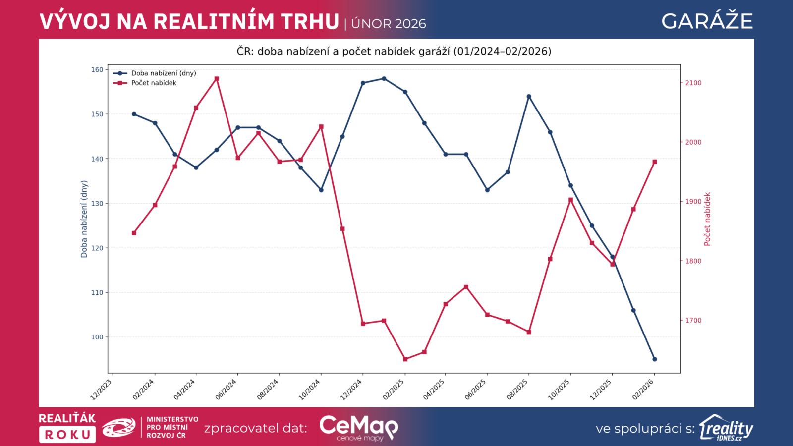 Vedle cen je důležité sledovat i rychlost trhu. Průměrná doba nabízení v celé republice činila 150 dní v lednu 2024, 158 dní v lednu 2025, ale už jen 106 dní v lednu 2026 a 95 dní v únoru 2026. Jinými slovy: trh s garážemi letos nejen zdražuje, ale oproti minulému roku také výrazně zrychlil.