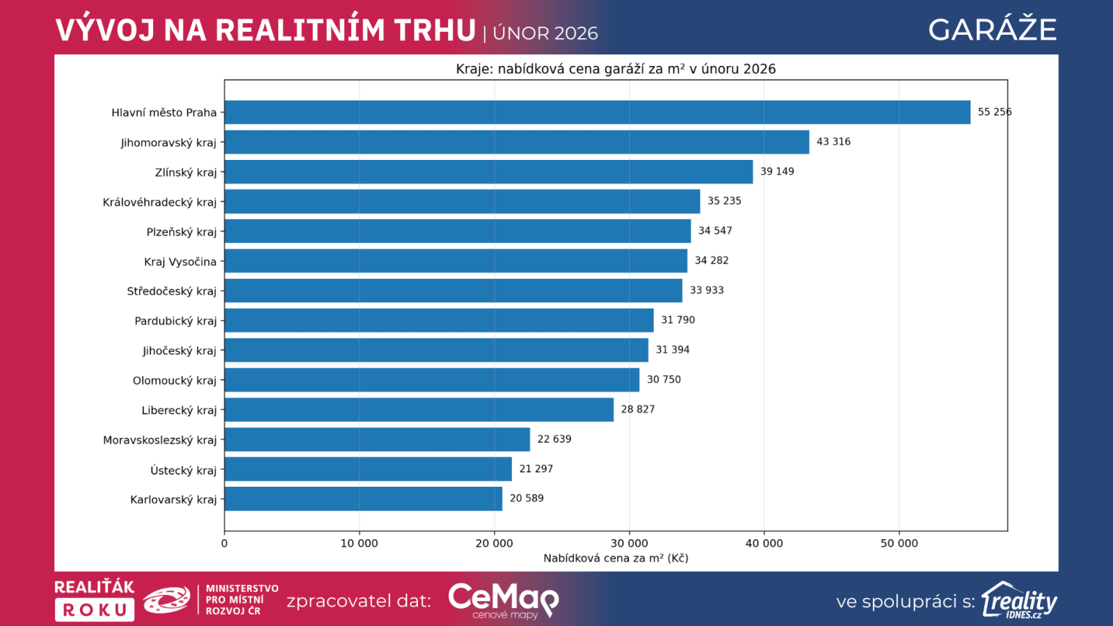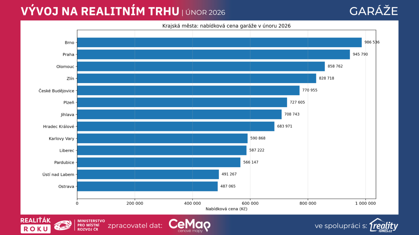 Vedle ceny za m² je ale užitečné sledovat i nabídkovou cenu garáže v korunách. Ta v únoru 2026 dosahuje v Praze 945 790 Kč, v Brně 986 536 Kč, v Olomouci 858 762 Kč, ve Zlíně 828 718 Kč a v Českých Budějovicích 770 955 Kč. Na krajské úrovni je nejvýš Hlavní město Praha s 945 790 Kč, Jihomoravský kraj s 914 609 Kč, Zlínský kraj s 720 526 Kč a dále Kraj Vysočina, Plzeňský a Středočeský kraj, všechny v pásmu zhruba 675 až 681 tisíc korun.