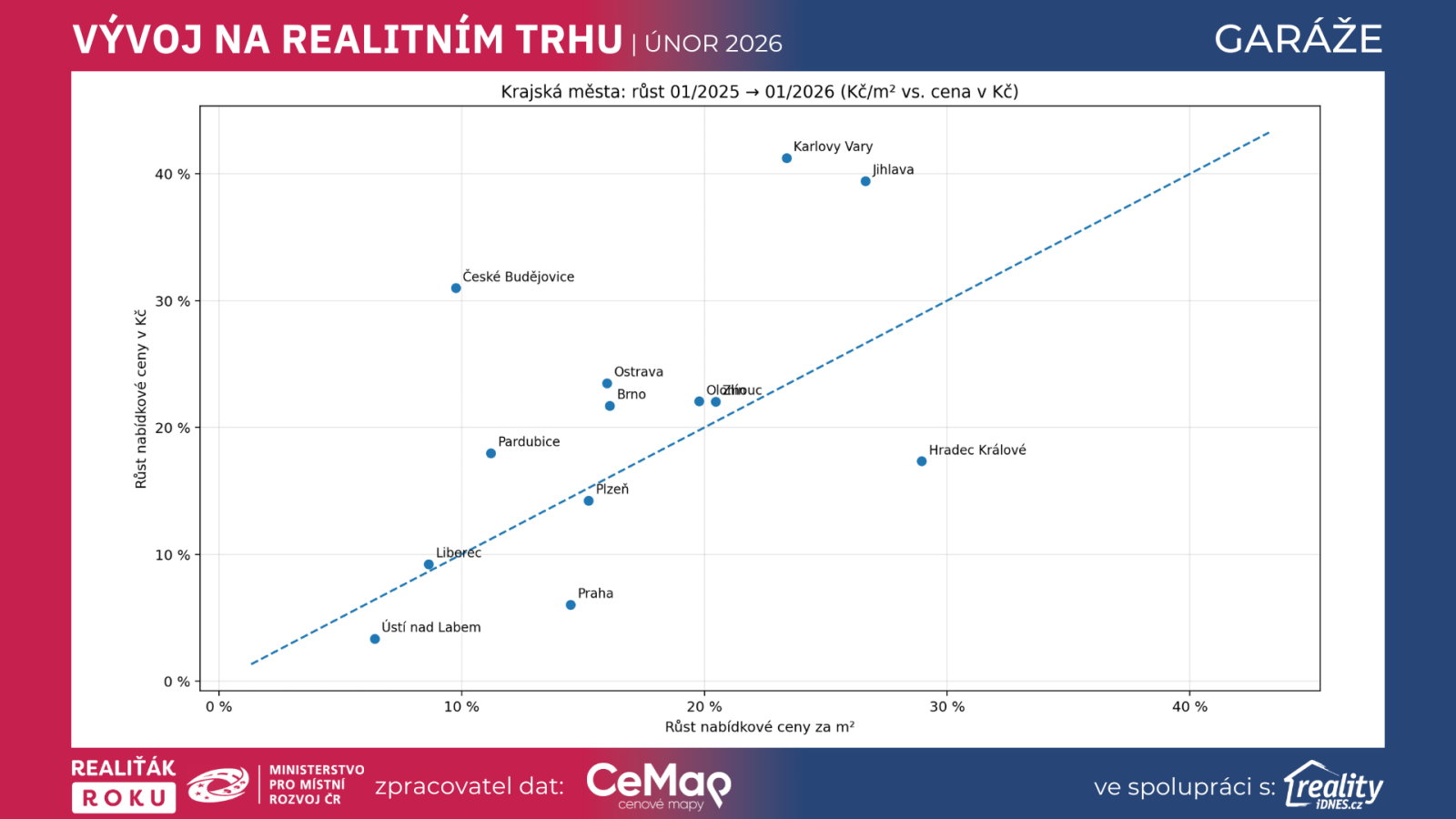 Na úrovni celé České republiky je trend velmi čitelný. Nabídková cena za m² u garáží vzrostla z 24 529 Kč v lednu 2024 na 27 804 Kč v lednu 2025 a dále na 32 665 Kč v lednu 2026. V únoru 2026 pak dosáhla 32 834 Kč za m². To znamená růst o 13,3 % mezi lednem 2024 a lednem 2025, následně o dalších 17,5 % mezi lednem 2025 a lednem 2026, a ještě mírné meziměsíční posílení o 0,5 % mezi lednem a únorem 2026.