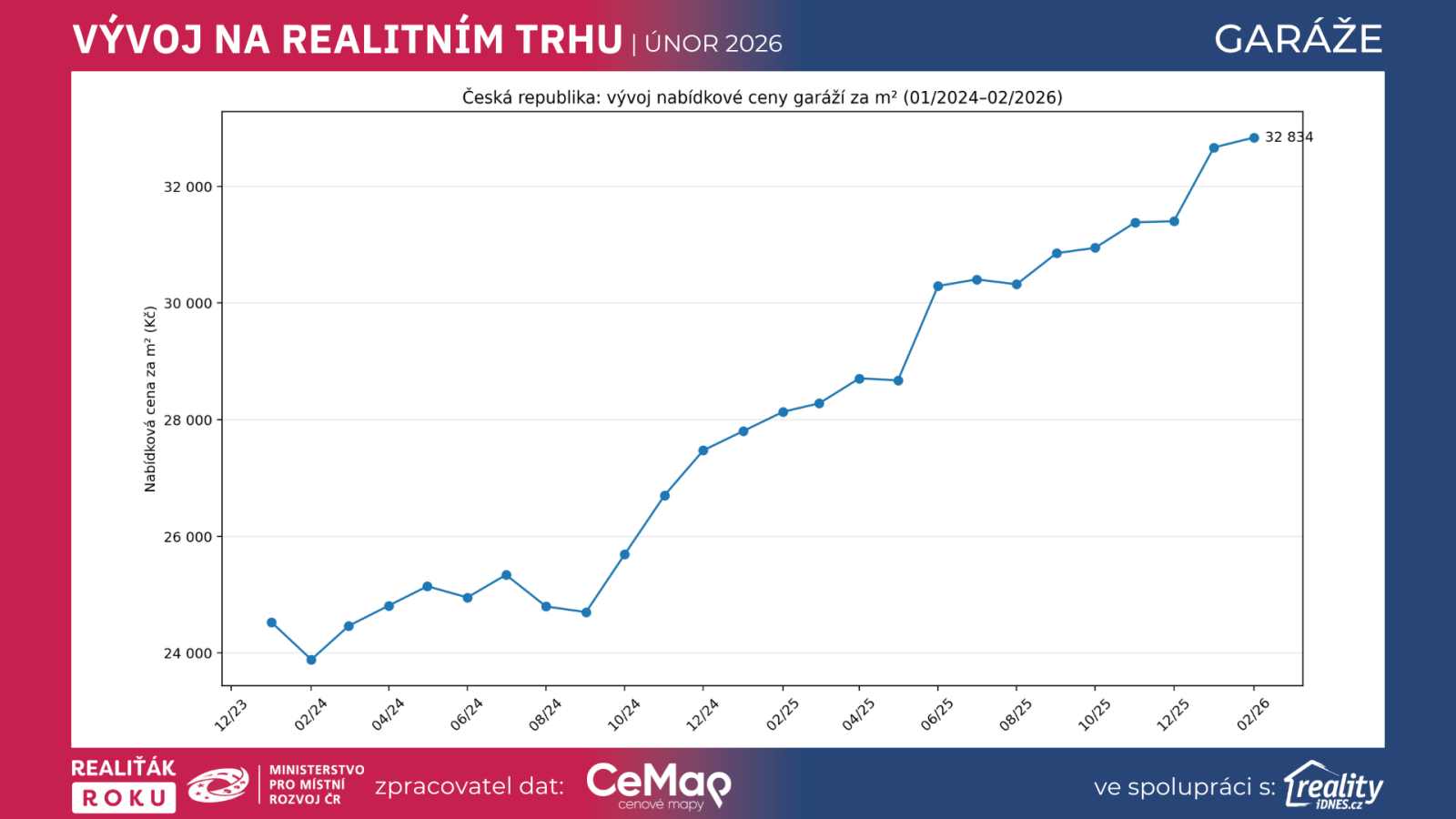 Trh s garážemi v České republice zůstává i na začátku roku 2026 ve velmi silné kondici. Přesné srovnání ledna 2024, ledna 2025, ledna 2026 a února 2026 ukazuje, že garáže ve většině krajů i krajských měst dál zdražují, a to jak v přepočtu na metr čtvereční, tak i v celkové nabídkové ceně v korunách. Současně ale platí, že obě metriky se nemusí pohybovat stejným tempem. Důvod je jednoduchý: v nabídce se mezi jednotlivými měsíci a roky mění i průměrná velikost garáží, takže růst ceny za m² nemusí kopírovat růst celkové nabídkové ceny.