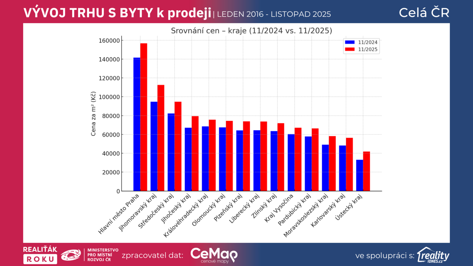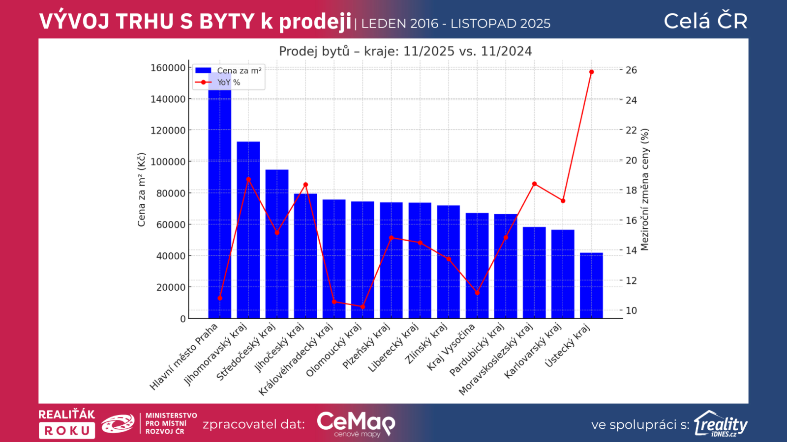 Za posledních dvanáct měsíců vyrostla průměrná cena prodávaných bytů v ČR z 80 859 Kč/m² (11/2024) na 93 628 Kč/m² (11/2025), tedy o 15,8 %. Doba nabízení se přitom propadla z 134 na 62 dní (–53,7 %), zatímco počet nabídek zůstal téměř stejný. Nejvýraznější růst cen zaznamenal Ústecký kraj (+25,9 %), ale i většina dalších regionů hlásí dvouciferné tempo růstu.