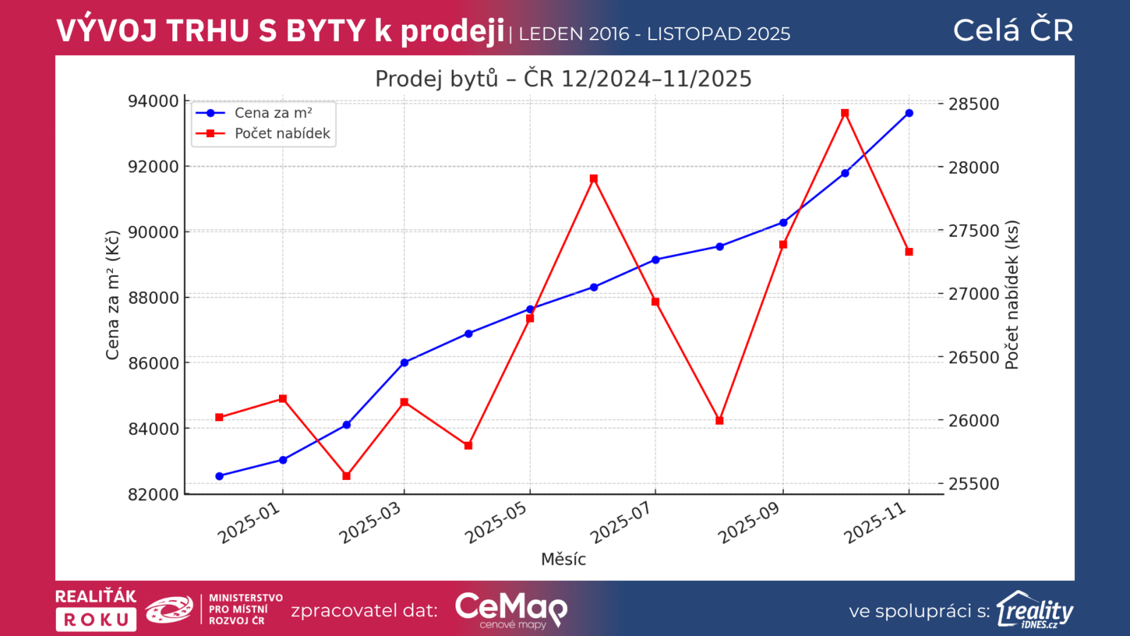 Cena za m² vzrostla z 80 859 Kč/m² v 11/2024 na 93 628 Kč/m² v 11/2025 – to je +15,8 % meziročně.
