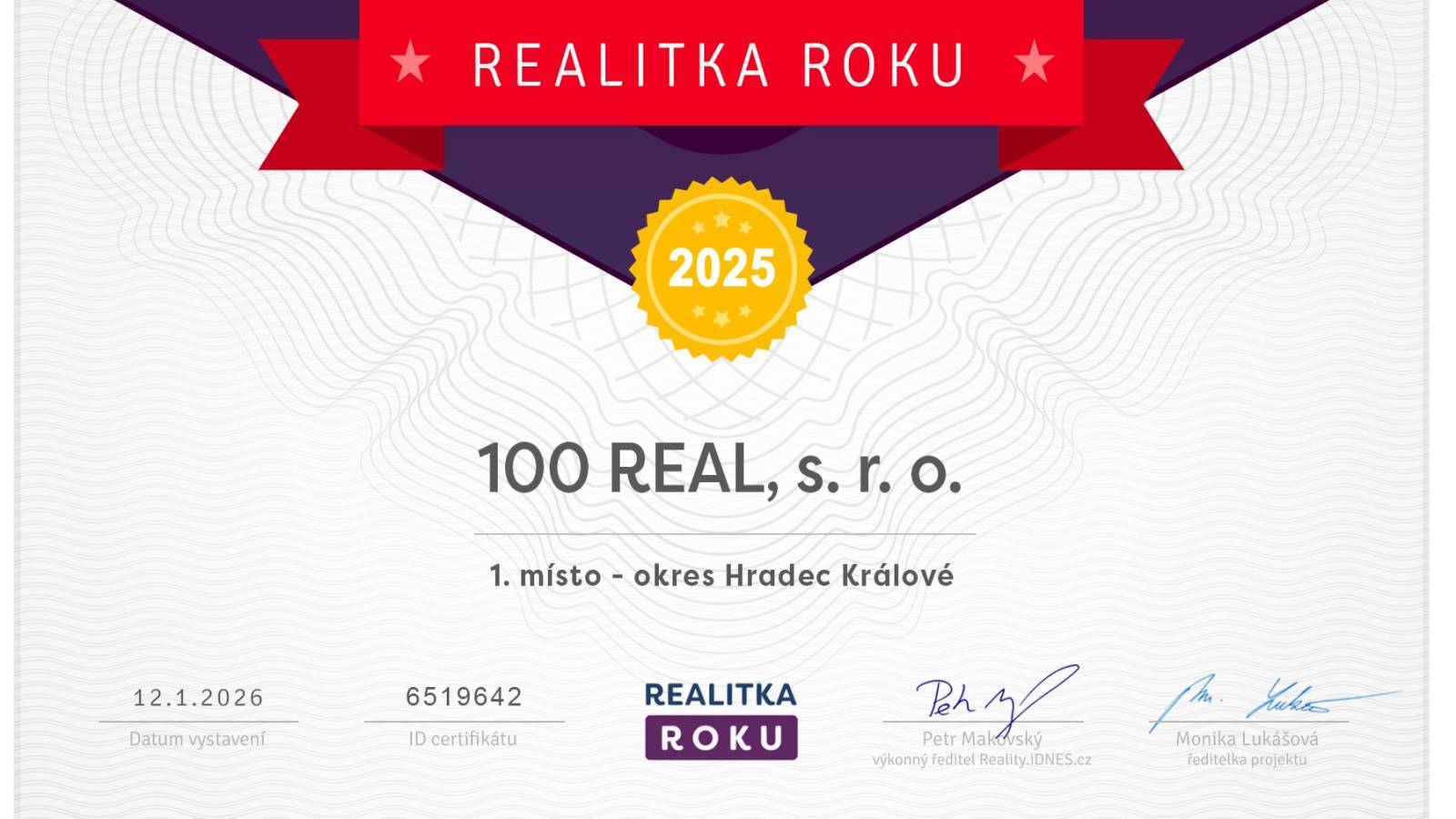 Diplom je oficiální dokument projektu – obsahuje identifikaci ocenění, datum, podpisy a často i identifikační údaje (např. ID certifikátu). Na ukázkovém diplomu je vidět mimo jiné datum vystavení 12. 1. 2026 a ID certifikátu 6519642, včetně podpisů a označení umístění „1. místo – okres Hradec Králové“.