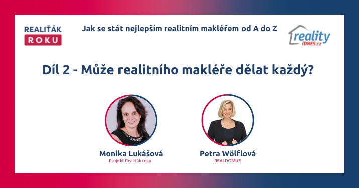 Dnes jsme opět zavítali do Českých Budějovic, opět jsme navštívili Petru Wölflovou a má to dva důvody. Petra vyhrála Realiťáka roku 2020, je teda skvělá realitní makléřka a mimo jiné je majitelkou realitní kanceláře Realdomus. A mě by dneska zajímalo, kdyby mi Petra poradila, prozradila její pohled na to, jaký by vlastně měl být člověk, který by se chtěl stát realitním makléřem, jaký by měl mít vlastnosti pro to, aby se mohl stát dobrým, nejlepším realitním makléřem. Aby nebyl ten průměrný. Petro, strávily jsme spolu den s makléřem, já jsem nasála atmosféru profese realitního makléře, musím říct, že mě to zaujalo, ta práce mi přijde pestrá, zajímavá, líbí se mi a hraju si s myšlenkou, že bych se chtěla stát realitním makléřem, realitní makléřkou. Myslíš, že bych se na to hodila? Nebo jaké bych měla mít vlastnosti kromě toho, že nejsem blondýna jako ty, ale jsem bruneta?