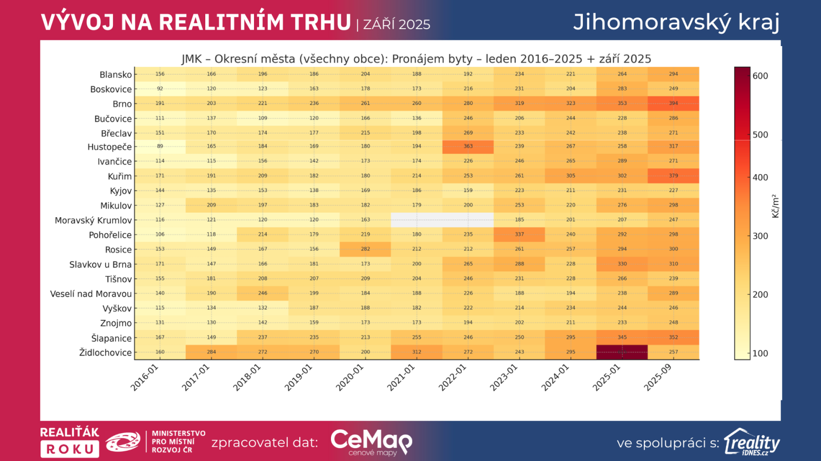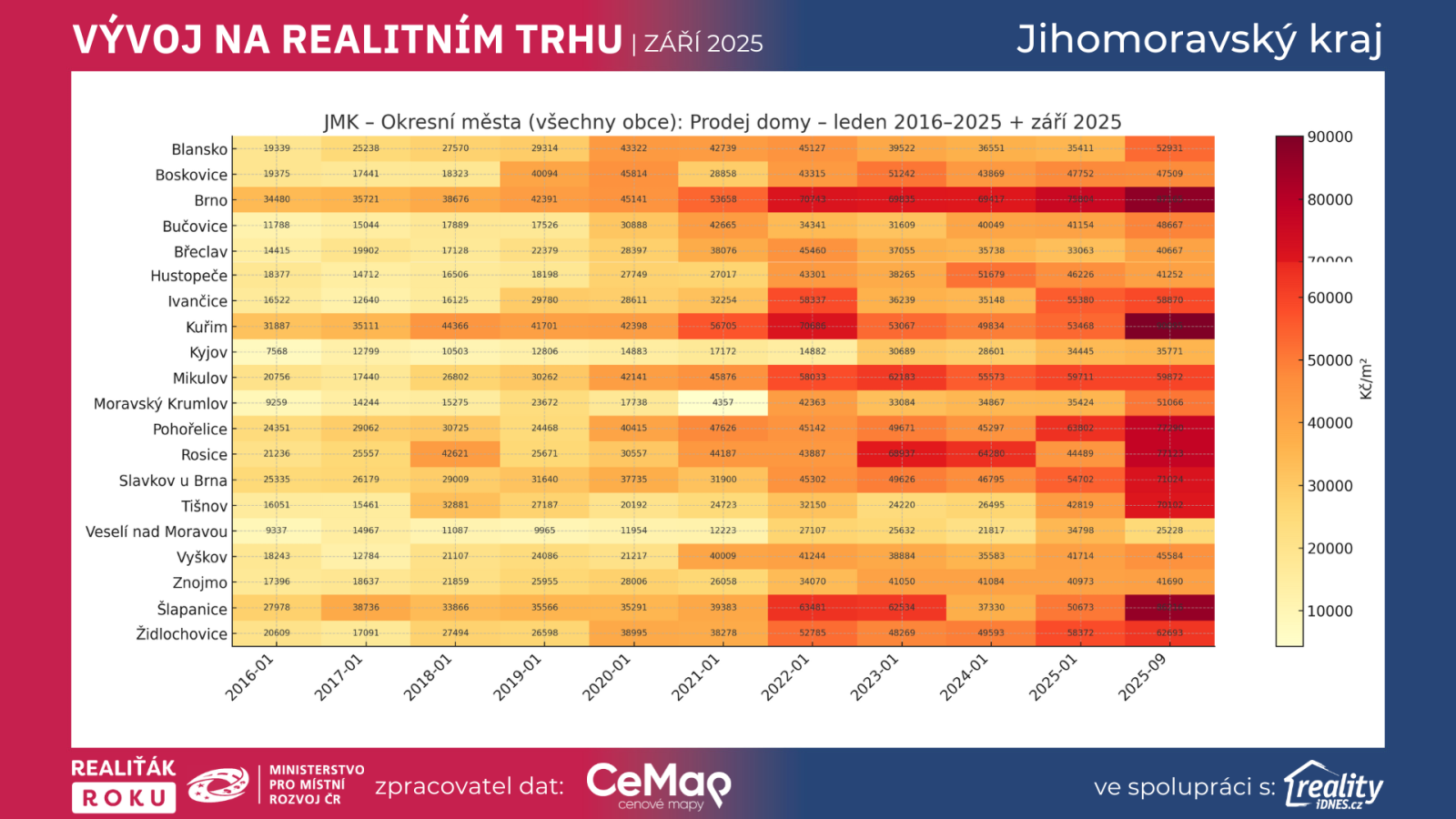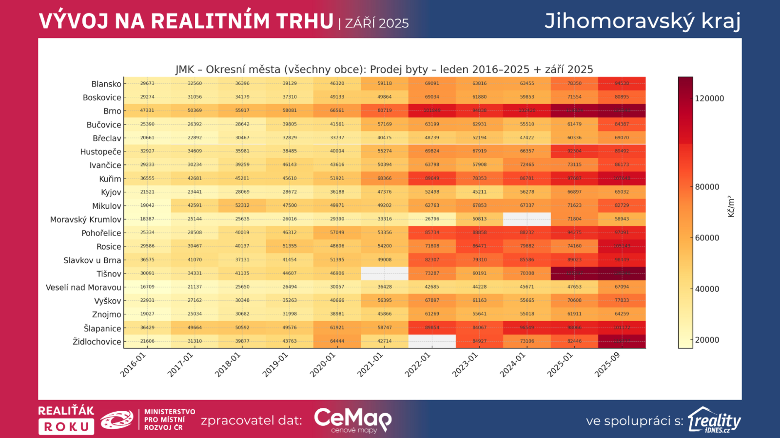 Brno a okresní centra (Blansko, Břeclav, Znojmo, Vyškov) tvoří jádro – tam je poptávka stabilně silná a cenová hladina vysoká.