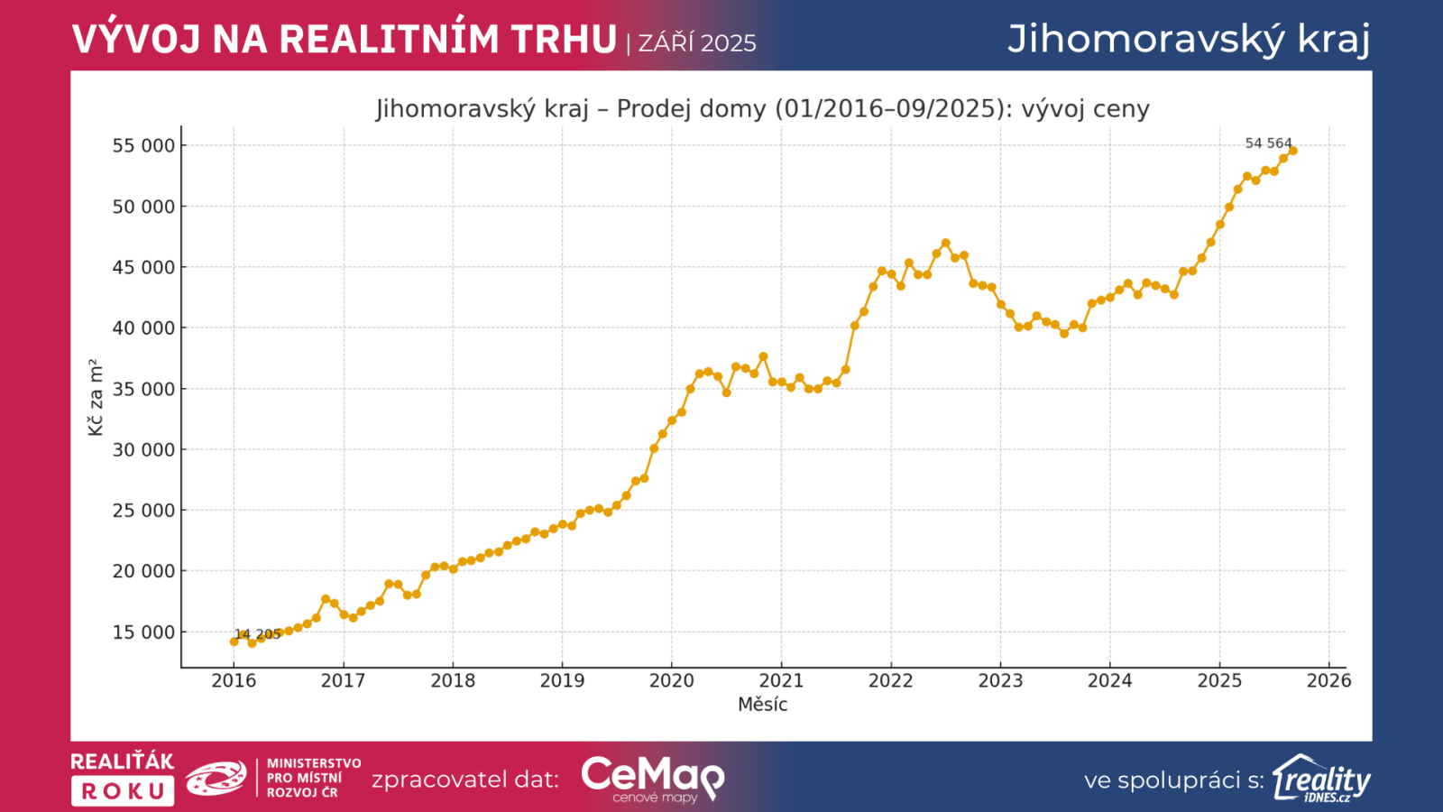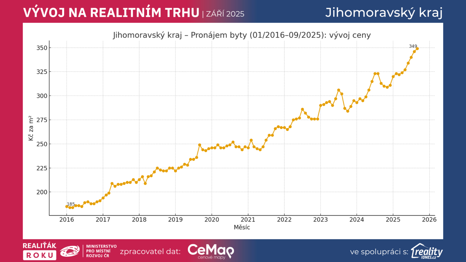 Jihomoravský kraj v září 2025 potvrzuje silné tempo napříč všemi klíčovými segmenty. Byty na prodej dosáhly v 09/2025 ceny 108 050 Kč/m² (nabídka 2 842 bytů, 75 dní inzerce). Před rokem, v 09/2024, to bylo 89 273 Kč/m², tedy +21,03 % meziročně; proti 09/2022 (85 398 Kč/m²) jde o +26,53 % za 3 roky. Nájemní byty se v září 2025 pronajímaly za 349 Kč/m², při 2 769 aktivních nabídkách a 18 dnech inzerce; rok předtím to bylo 313 Kč/m² (+11,50 % YoY; proti 09/2022 278 Kč/m², tj. +25,54 % za 3 roky). Domy na prodej vystřelily v 09/2025 na 54 564 Kč/m² (nabídka 3 148 domů, 99 dní inzerce) – v 09/2024 činila cena 44 635 Kč/m², což je +22,24 % YoY; vůči 09/2022 (45 981 Kč/m²) +18,67 %.