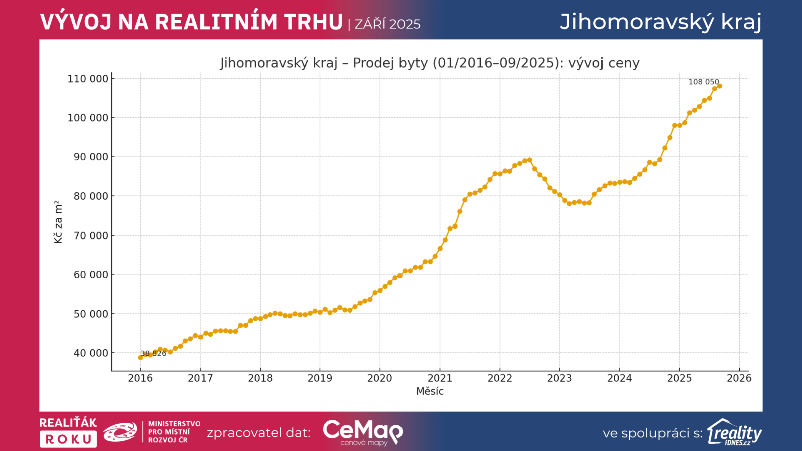 Jednou větou: Jihomoravský kraj v 09/2025 nabízí rychlý a cenově rostoucí trh – byty 108 050 Kč/m² (+21 %), nájmy 349 Kč/m² (+11,5 %), domy 54 564 Kč/m² (+22 %) – s tím, že Brno (a jeho prstenec) je motorem, který určuje rytmus celému regionu. Pro prodávající je to silné okno, pro kupující nutnost připravenosti, pro investory čitelná výnosová rovnice: kvalita + lokalita + rychlá exekuce.