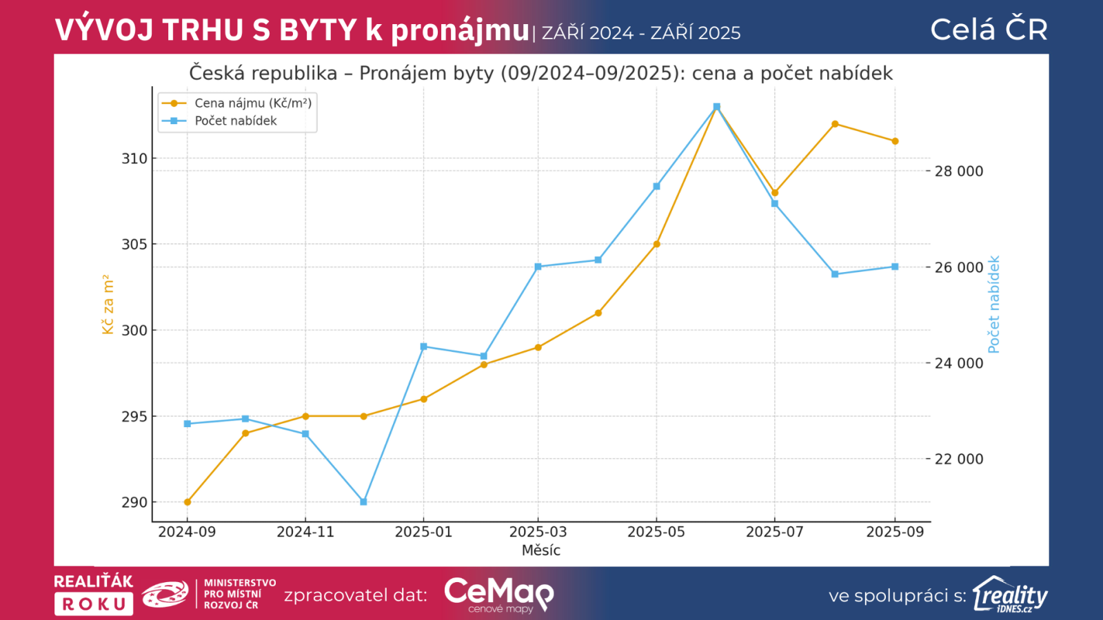 Za posledních dvanáct měsíců se trh nájemního bydlení v Česku dál zpevnil, ale bez cenového skoku. V 09/2025 činila celorepubliková cena nájmu 311 Kč/m², zatímco v 09/2024 to bylo 290 Kč/m² – tedy +7,24 % meziročně. V nabídce bylo 26 007 bytů a doba inzerce spadla na pouhých 22 dní (vše vždy za konkrétní měsíc, bez průměrů). Zájem o kvalitní a menší dispozice zůstává obrovský a regionální rozdíly se spíš prohlubují.
