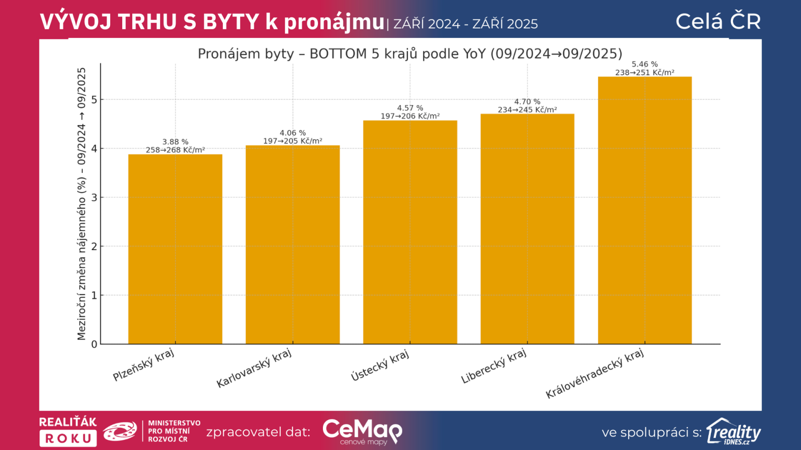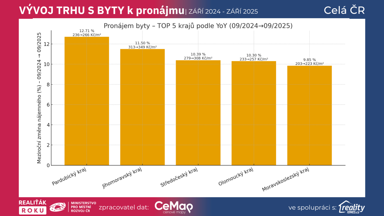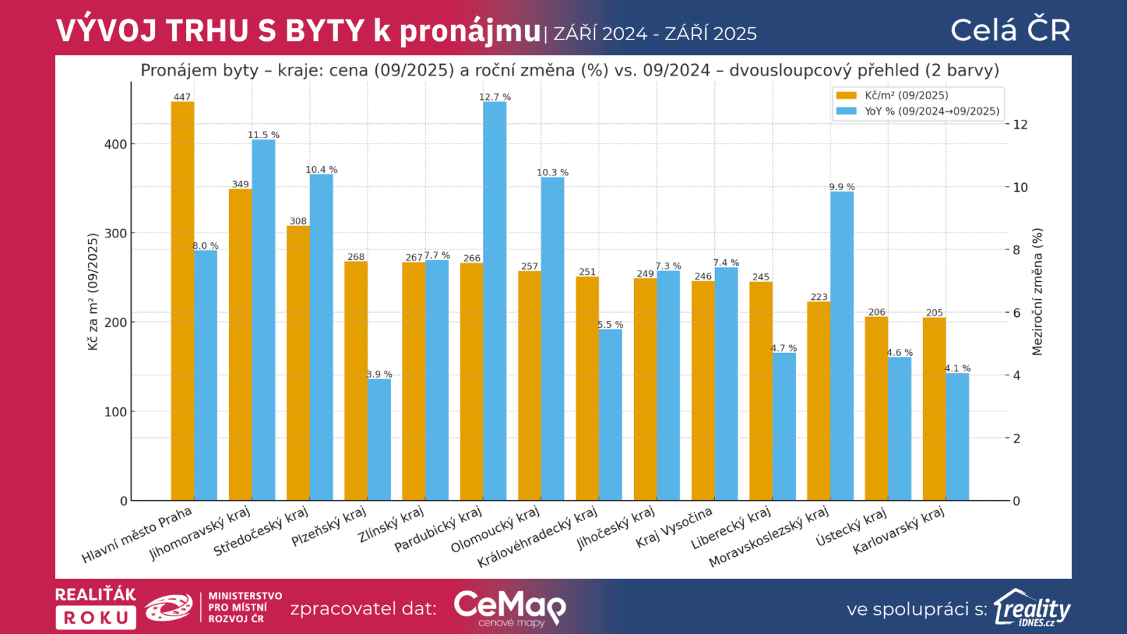 Níže jsou přesná srovnání pro typ: Pronájem byty na krajské úrovni. U každého kraje uvádím hodnotu v 09/2024, v 09/2025 a meziroční změnu.