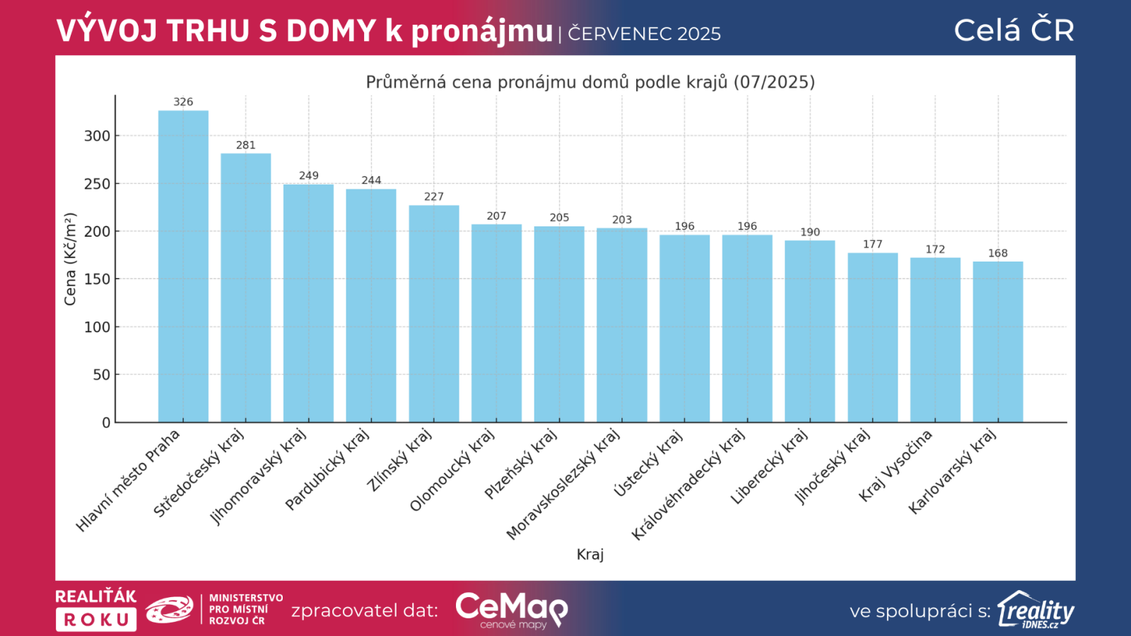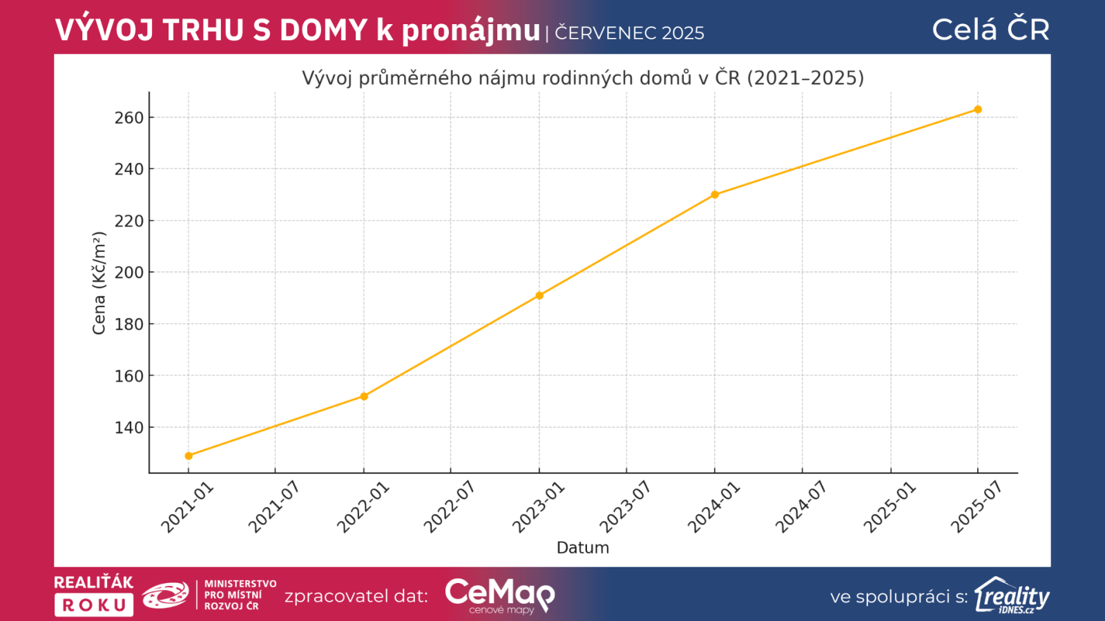 Průměrná cena nájmu domu v ČR: 263 Kč/m² (07/2025).