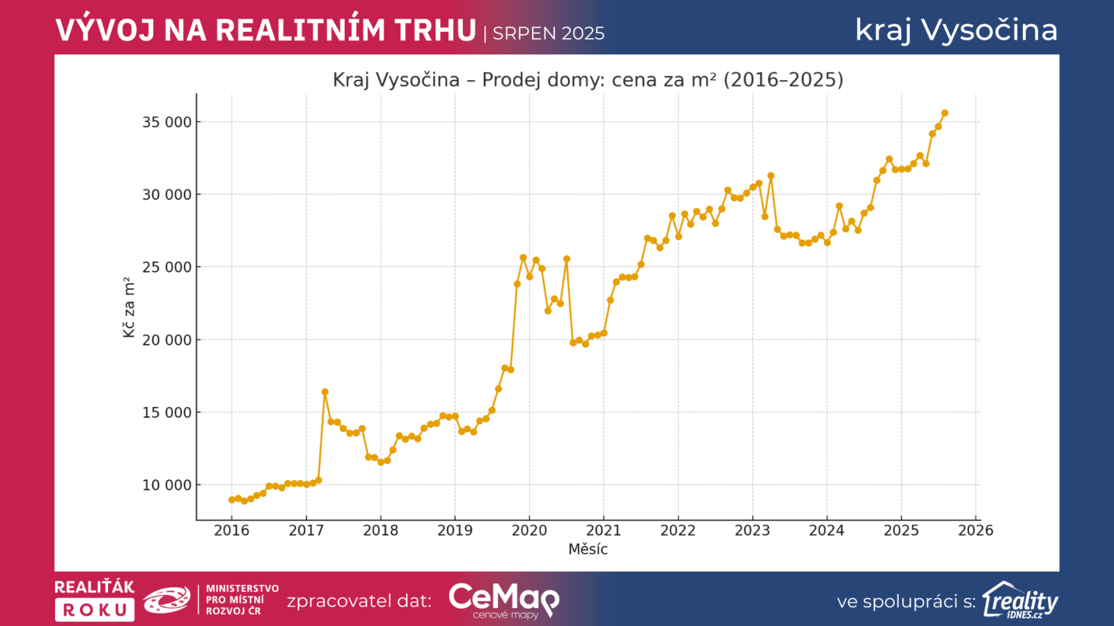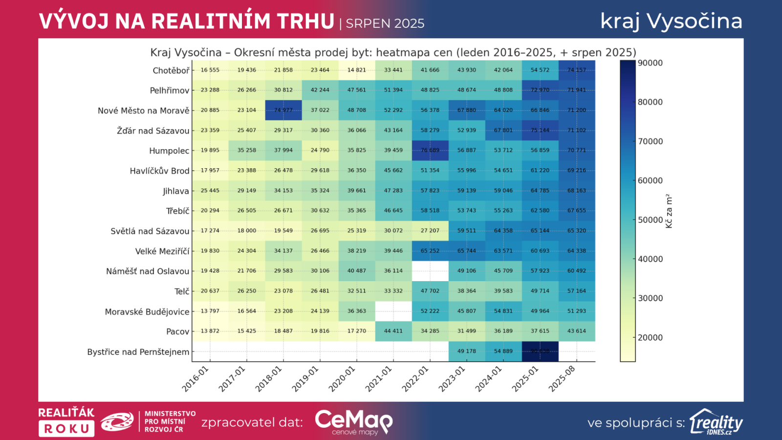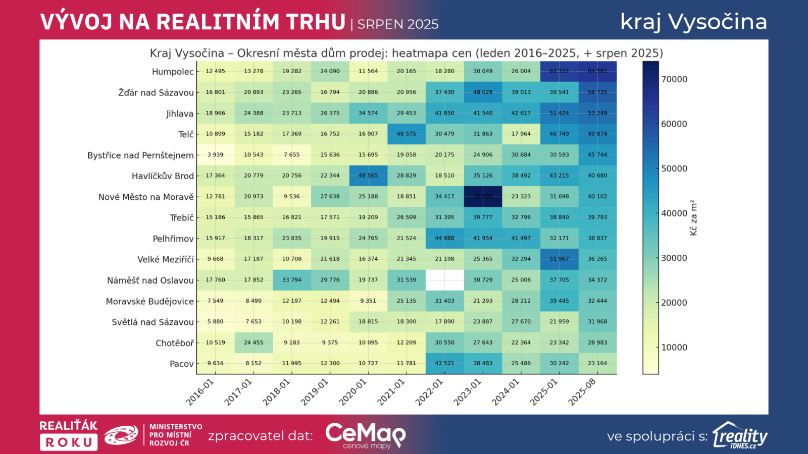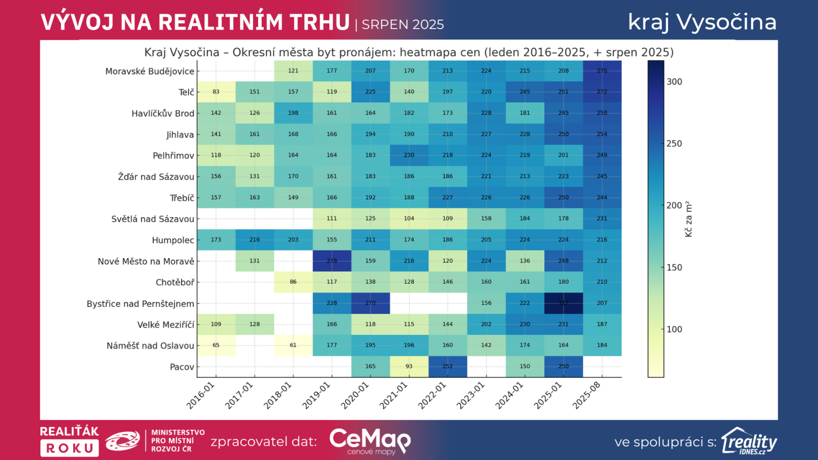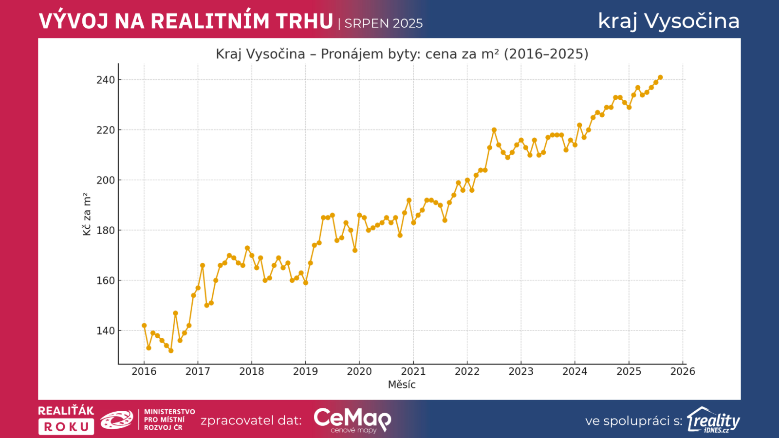 Vysočina zůstává cenově dostupnějším regionem, přesto tu poslední tři roky proběhl zřetelný růst. V 08/2025 stojí byty na prodej 64 009 Kč/m² (v 08/2022 56 479 Kč/m², +13,3 %), v nabídce je 564 bytů a doba inzerce 75 dní. Nájemní byty jsou na 241 Kč/m² (214 Kč/m², +12,6 %), 631 nabídek a 37 dní inzerce. Domy na prodej dosahují 35 601 Kč/m² (29 009 Kč/m², +22,7 %), v nabídce 1 244 domů a 95 dní inzerce. (Vysočina, přesné hodnoty z 08/2025 a 08/2022.)