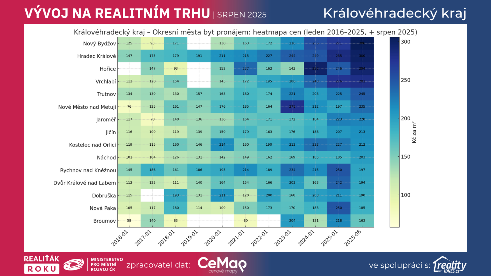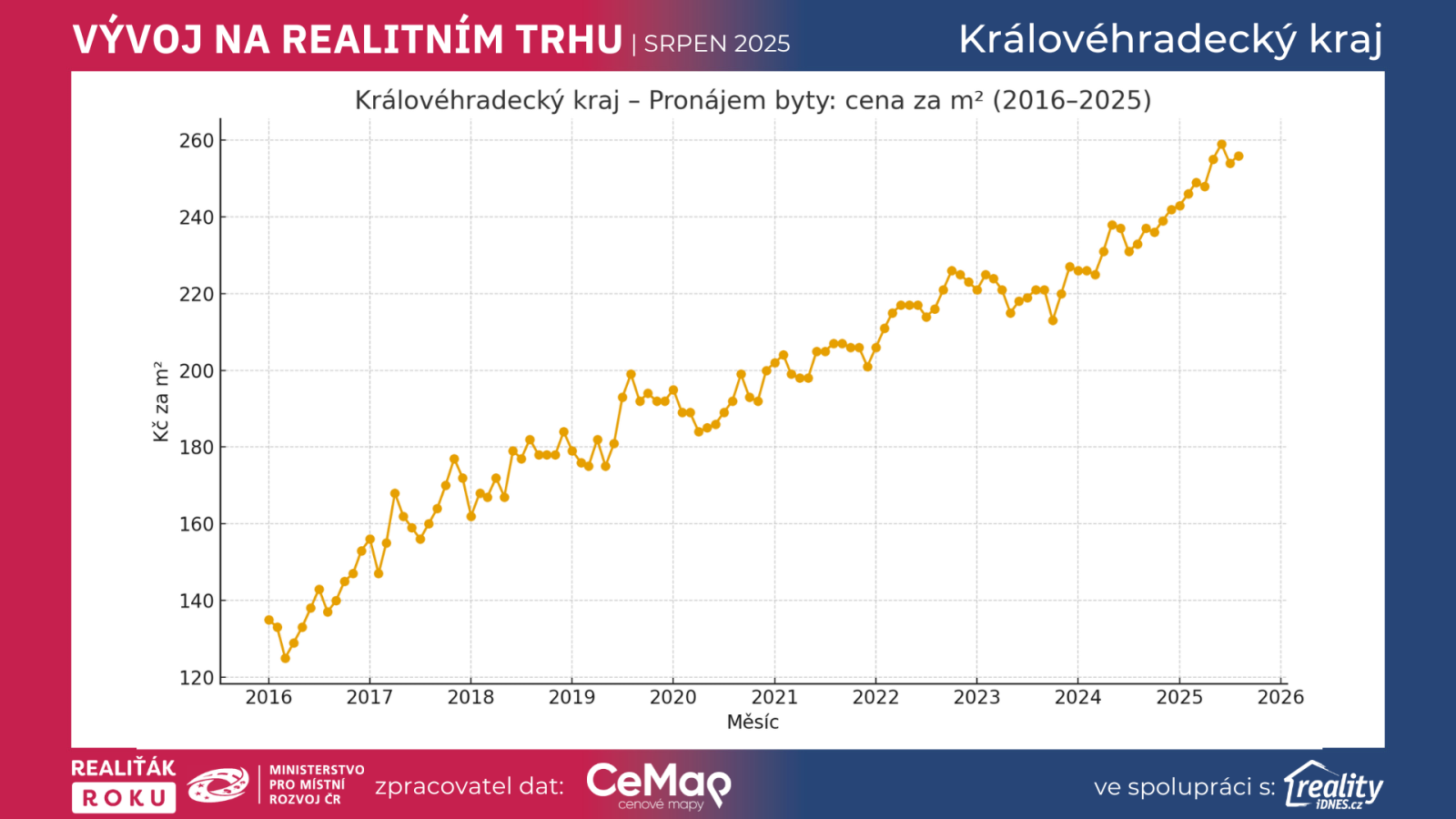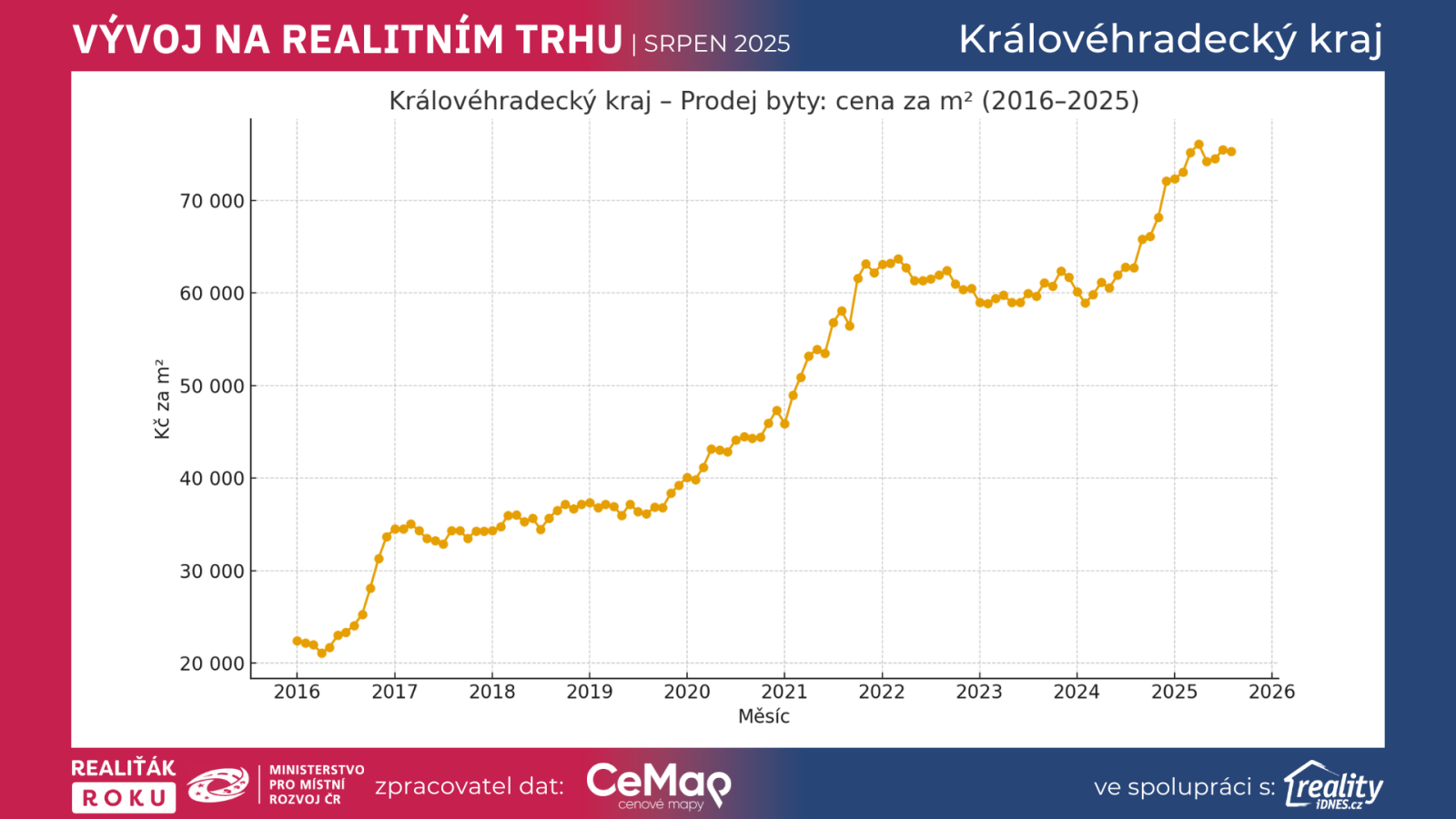 Královéhradecký patří v létě 2025 k nejživějším regionům českého realitního trhu. Byty na prodej stojí v 08/2025 v průměru 75 302 Kč/m² (v 08/2022 61 976 Kč/m², +21,5 %), nájemní byty 256 Kč/m² (216 Kč/m², +18,5 %) a domy na prodej 43 702 Kč/m² (32 416 Kč/m², +34,8 %). Do nabídky vstoupilo 1 117 bytů k prodeji (doba inzerce 77 dní), 676 nájemních bytů (21 dní) a 1 445 domů (92 dní). Oproti ČR (byty 90 243 Kč/m², nájmy 313 Kč/m², domy 49 023 Kč/m²) je kraj levnější, ale roste svižně a u nájmů má mimořádně rychlou obrátku.