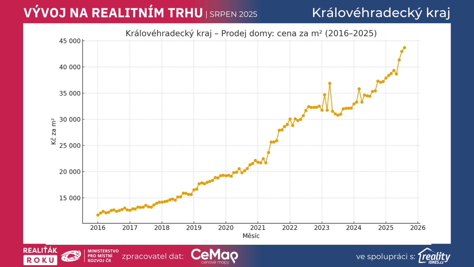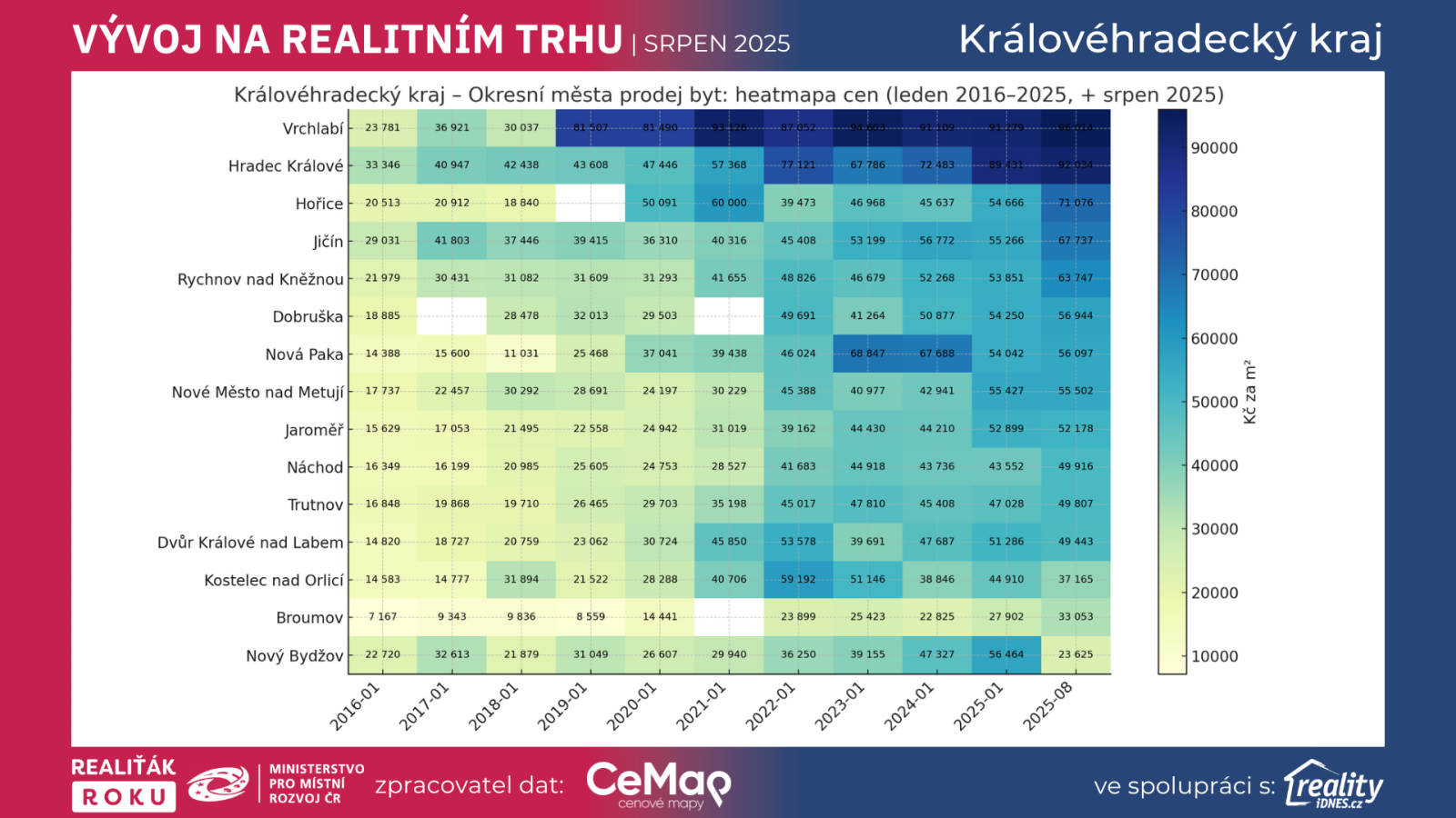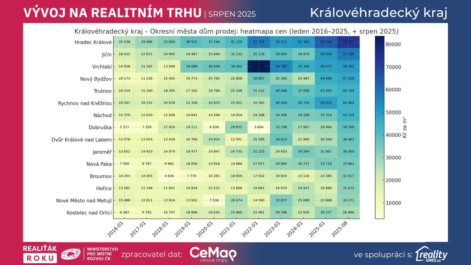 Královéhradecký patří v létě 2025 k nejživějším regionům českého realitního trhu. Byty na prodej stojí v 08/2025 v průměru 75 302 Kč/m² (v 08/2022 61 976 Kč/m², +21,5 %), nájemní byty 256 Kč/m² (216 Kč/m², +18,5 %) a domy na prodej 43 702 Kč/m² (32 416 Kč/m², +34,8 %). Do nabídky vstoupilo 1 117 bytů k prodeji (doba inzerce 77 dní), 676 nájemních bytů (21 dní) a 1 445 domů (92 dní). Oproti ČR (byty 90 243 Kč/m², nájmy 313 Kč/m², domy 49 023 Kč/m²) je kraj levnější, ale roste svižně a u nájmů má mimořádně rychlou obrátku.