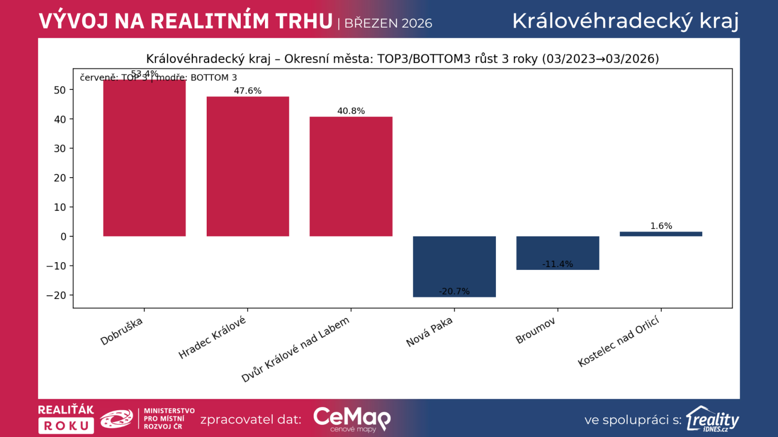 Právě na úrovni okresních měst je u Královéhradeckého kraje velmi dobře vidět, jak odlišný může být vývoj uvnitř jednoho regionu. Krajská čísla jsou silná, ale teprve lokální pohled ukáže, kde je cenové jádro, kde probíhá nejrychlejší růst a kde se naopak trh vyvíjí mnohem klidněji — nebo dokonce klesá.