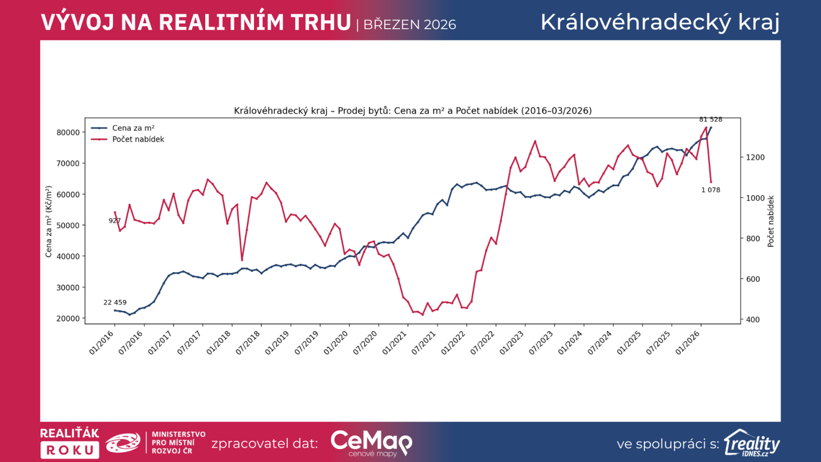 V 03/2026 dosáhla v Královéhradeckém kraji Cena za m² u prodeje bytů 81 528 Kč/m², Doba nabízení klesla na 68 dní a v nabídce bylo 1 078 bytů.