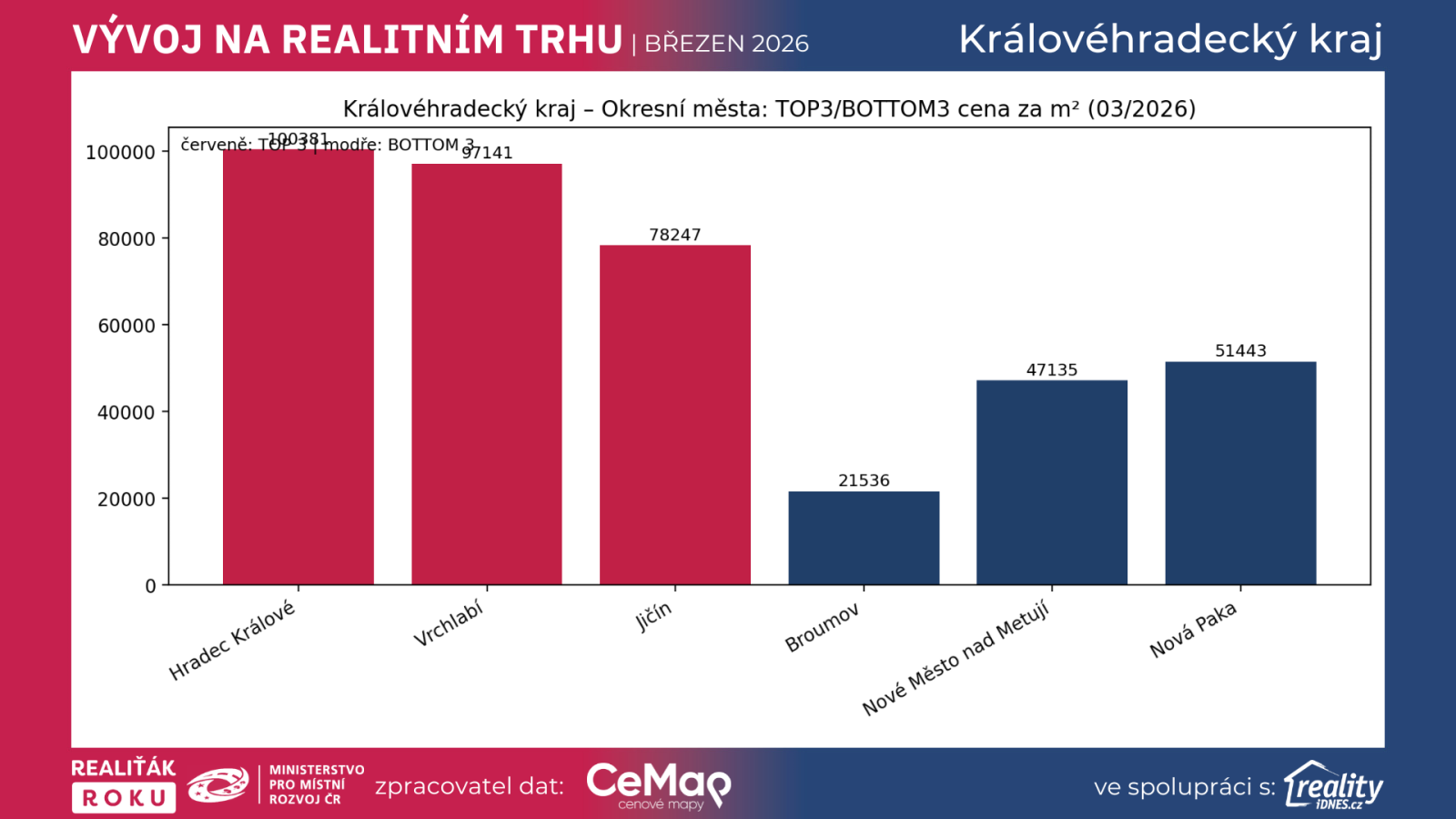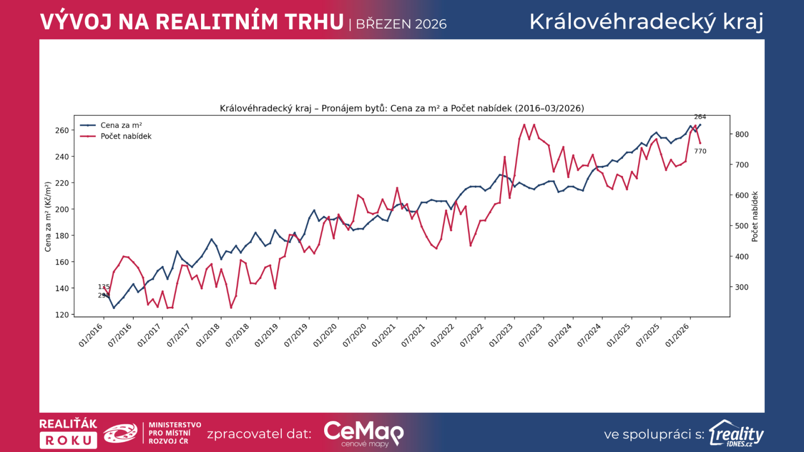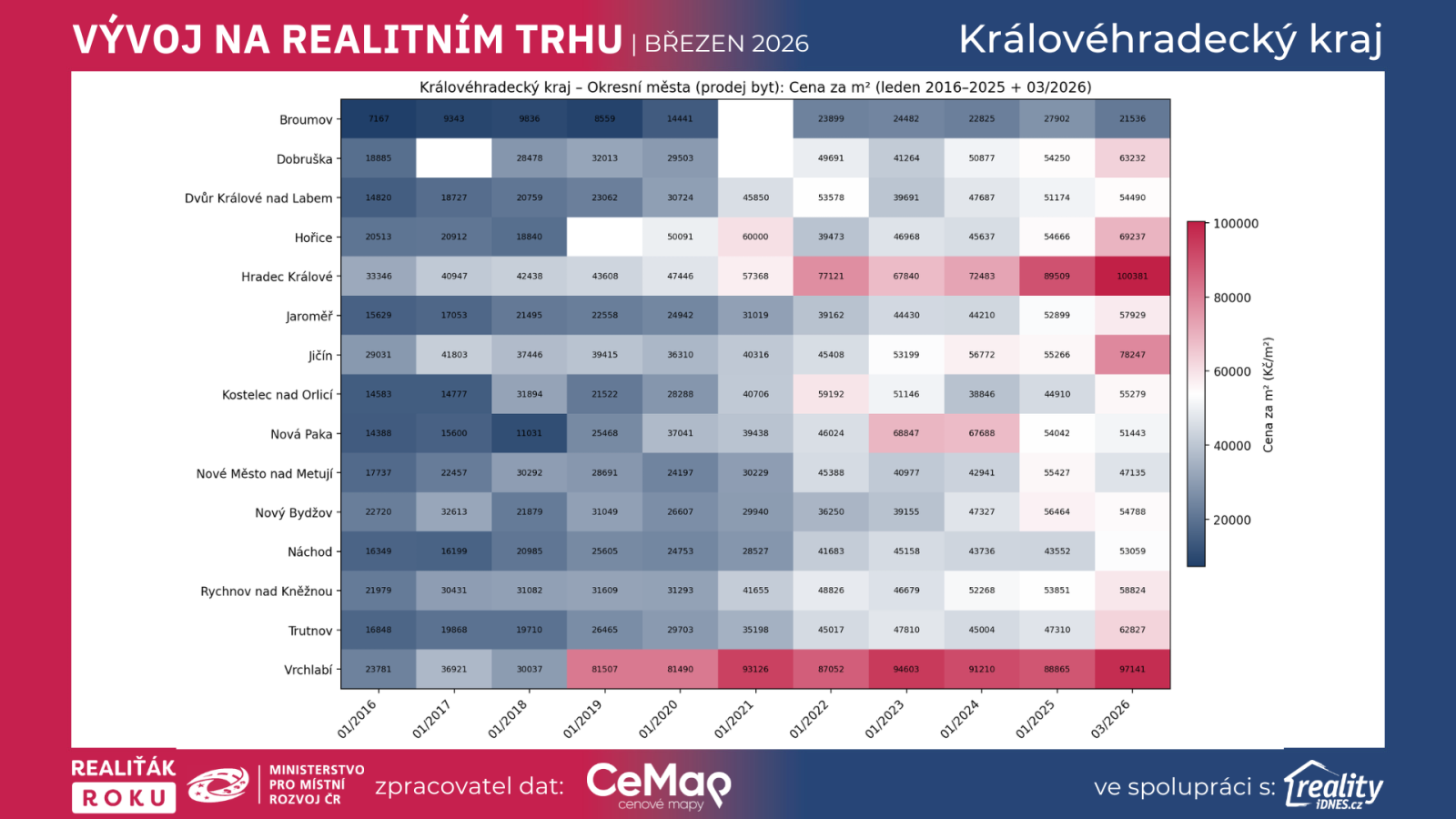 Královéhradecký kraj patří v posledních letech k regionům, které potvrzují, že silný realitní trh nemusí být výsadou jen Prahy, Brna nebo Středočeského kraje. V 03/2026 dosáhla v kraji Cena za m² u prodeje bytů 81 528 Kč/m², u prodeje domů 44 036 Kč/m² a u pronájmu bytů 264 Kč/m².
