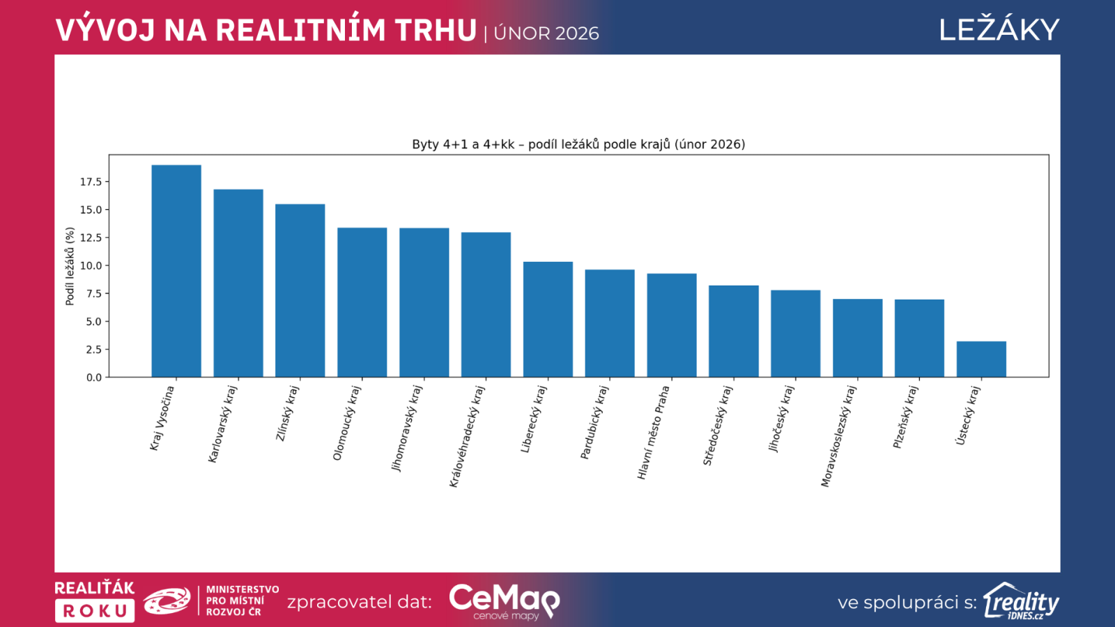 Vysočina je v únoru 2026 v TOP 2 u bytů (9,58 %) i u domů (11,93 %). Z dispo pohledu je zajímavé, že u 4+ bytů vychází Vysočina v roce 2026 dokonce jako jedna z nejvyšších (podíl ležáků 4+ je zde 18,97 %, ale z menší základny nabídky). To ukazuje typickou realitu regionů: u velkých bytů stačí pár „neprodejných“ kusů a podíl ležáků výrazně vyskočí.
