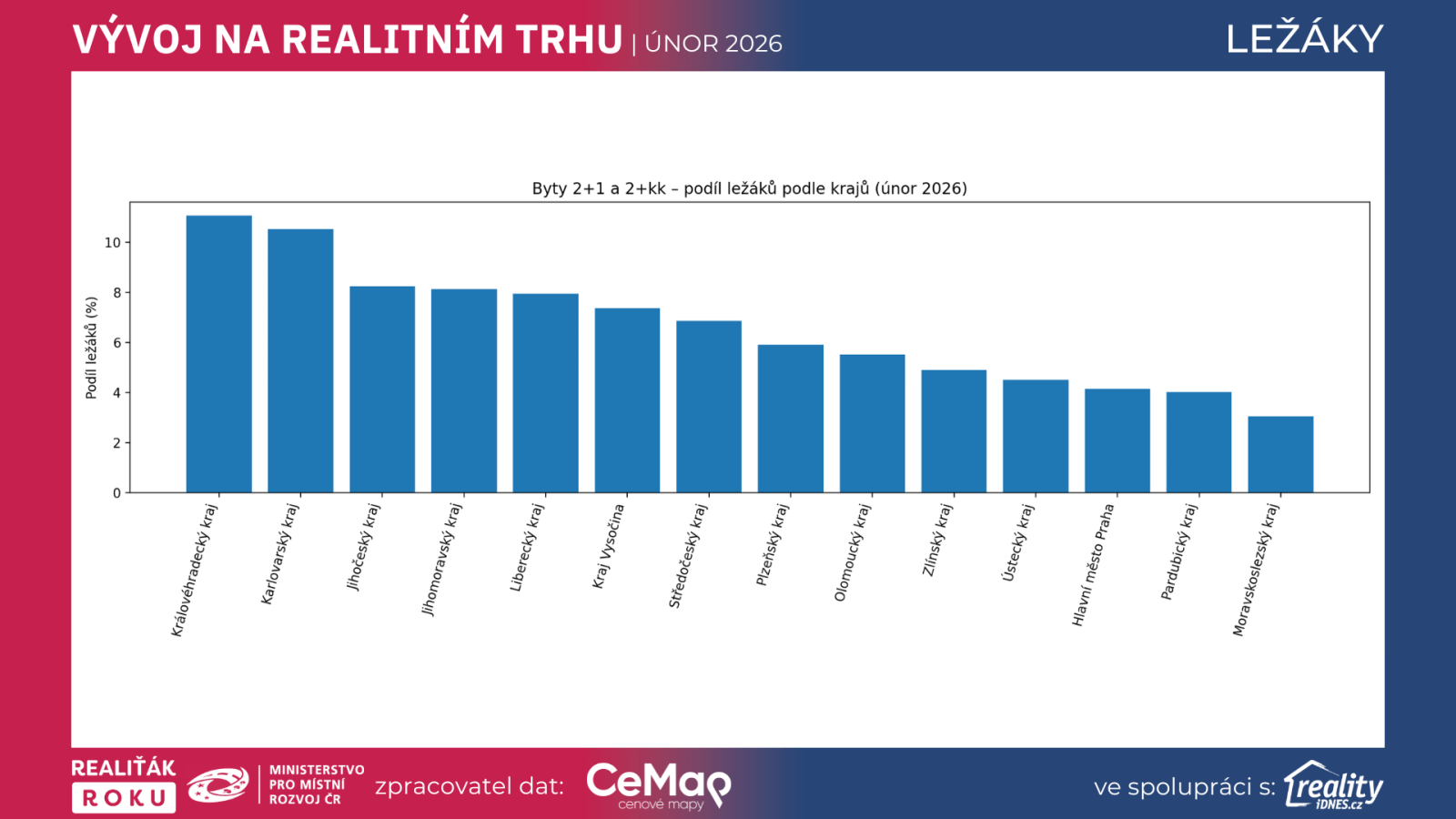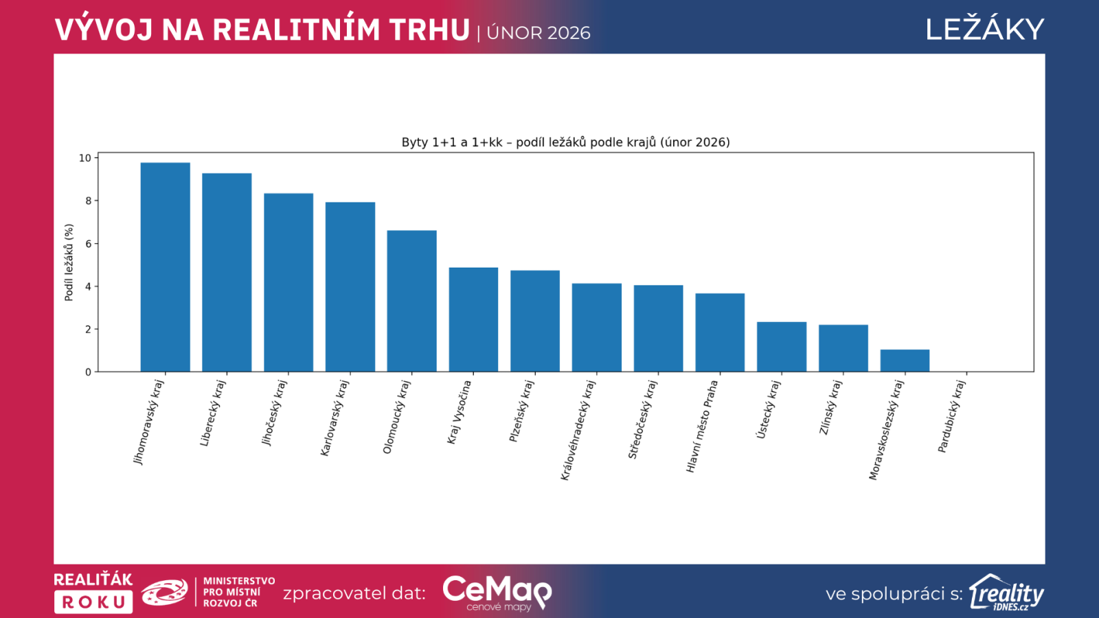 Nejnižší kraje jsou kolem 9,5–10,3 %, tedy i „nejlepší“ kraje mají pořád zhruba desetinu nabídky ve formě ležáků.