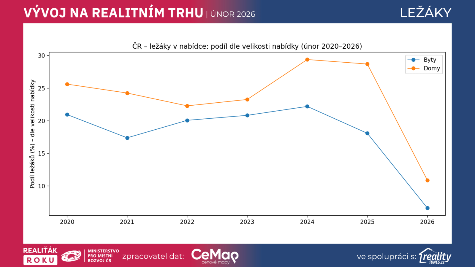 U domů je pokles v roce 2026 také dramatický. Zároveň je důležité, že domy mají dlouhodobě vyšší „ležákovost“ než byty – i v roce 2026 (10,89 % vs 6,63 %).