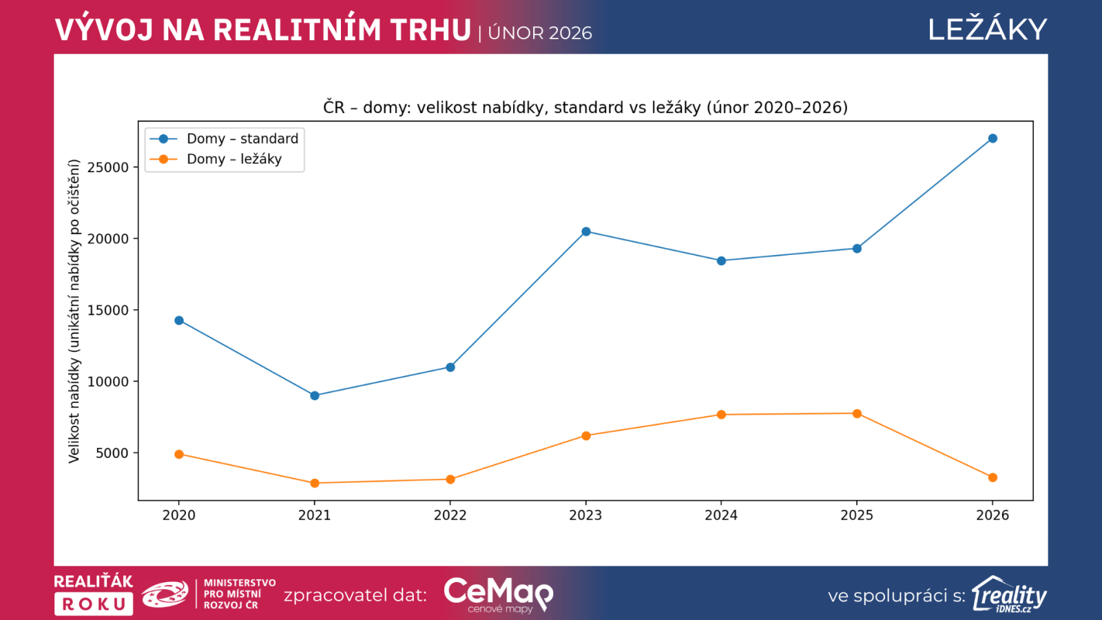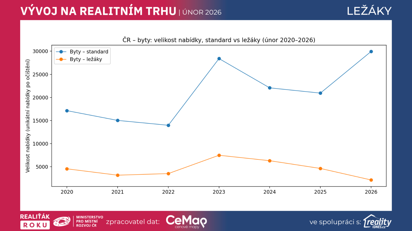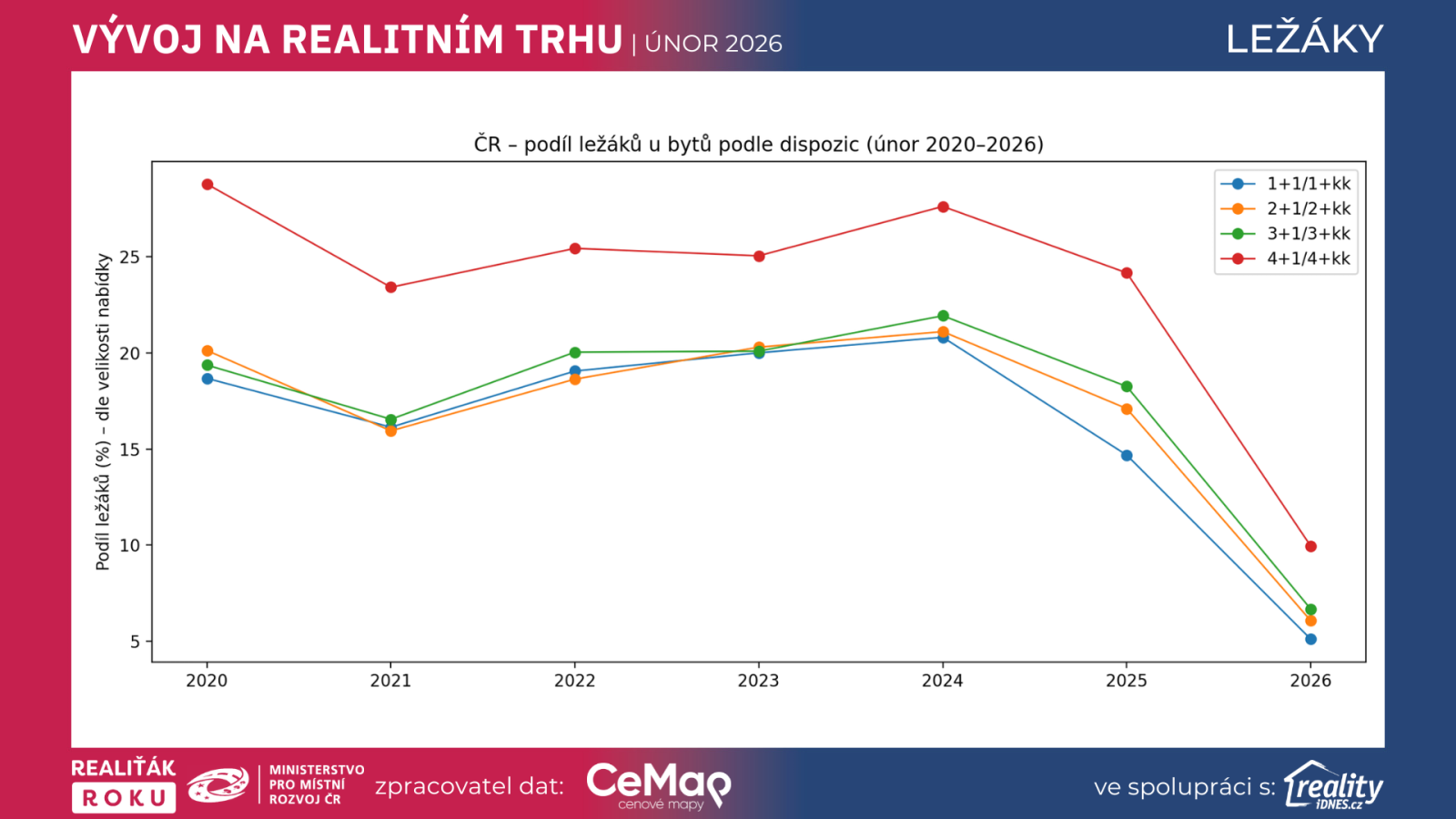 Ležáky – tedy nabídky, které zůstávají na trhu déle než 365 dní – jsou velmi praktickým indikátorem toho, kde se potkává (nebo nepotkává) cena, kvalita nabídky a poptávka. Nový dataset přináší srovnání napříč roky 2020 až 2026, vždy ve stejném měsíci (únor), což je pro porovnání výhodné. Ukazuje nejen vývoj pro byty a domy v celé ČR, ale také detail pro hlavní bytové dispozice (1+… až 4+…) a základní pohled na kraje.