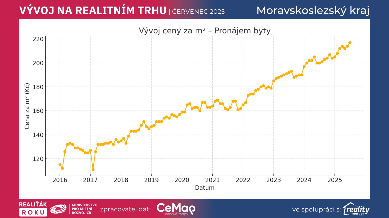 Nájemní trh v Moravskoslezském kraji je v současnosti jeden z nejdynamičtějších v republice. V lednu 2016 činilo průměrné nájemné 128 Kč/m², v roce 2020 se přehouplo přes 170 Kč/m², a v červenci 2025 je již na hodnotě 217 Kč/m².