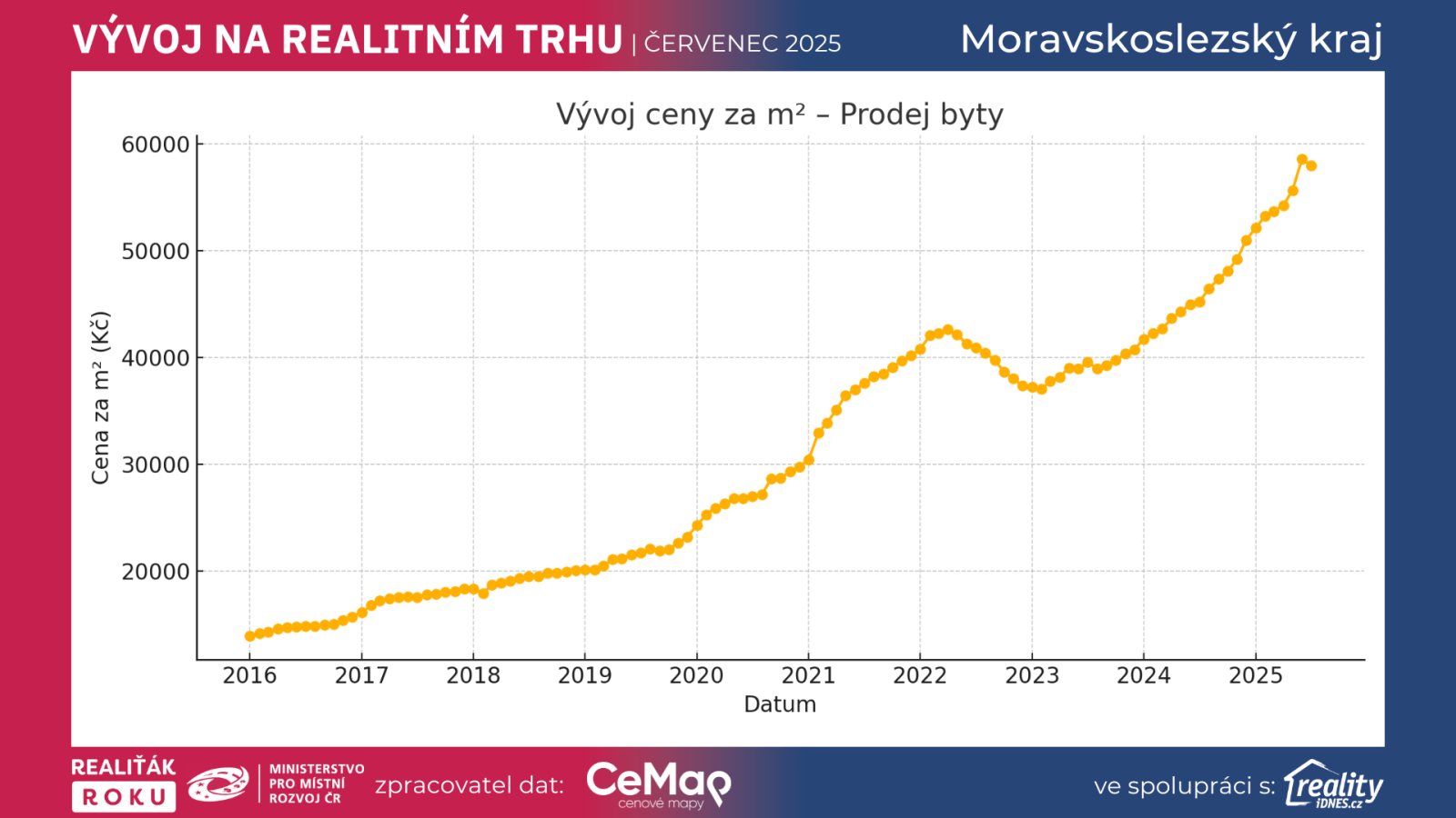 V lednu 2016 činila průměrná cena bytů na prodej v Moravskoslezském kraji pouhých 13 928 Kč/m². V průběhu let docházelo k postupnému zrychlování růstu: v roce 2020 už cena překonala hranici 25 tisíc Kč/m², v roce 2022 šlo o více než 45 tisíc Kč/m² a v červenci 2025 cena dosáhla 57 948 Kč/m². Za 9 let tak došlo k nárůstu o více než 315 %, což je jeden z nejprudších skoků v celé republice (z nízké základny).